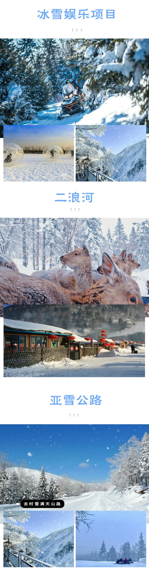 07:30 吃早餐后办理退房,大家不要忘记东西,记得要退房卡押金。出发去往亚布力/亚洲最大的综合性滑雪场远眺:数十条滑雪道犹如蜿蜒的巨龙映入眼帘,气势十分壮观身临其境——东方的达沃斯、滑雪者的天堂!景区消费比较高,建议大家AA吃团餐,30元一人即可,咱们是独家领队带领打卡亚布力,也可以亚布力滑雪场体验滑雪2个小时(费用自理)。雪场有专业的滑雪教练,如果想系统的学习滑雪,请一位靠谱的教练还是很有必要的(费用有点小贵大概280元/2小时)亚布力请教练存在索要小费不良风气。遇到这种事情,可以不用理会。15:00 集合前往二浪河住宿分房,当地最特色农家给贵宾们入住,感受东北农村的年味,进屋先坐在【东北大炕】上学几句东北话唠唠嗑,穿上乡村特色的花棉袄凹造型拍照,玩大烟袋嘎拉哈。在很久很久以前,在东北交通基本靠走,通讯基本靠吼,治安基本靠狗,取暖基本靠抖,那时候的人们有一辆马车就已经相当于现在拥有一辆宝马了,来到东北必须体验最原始的土豪交通工具——【马拉爬犁】东北黑天早第二天乘坐,晚上逛逛宁静雪村。八点集合DIY包饺子,东北有句话叫饺子就酒,越喝越有。第二天早上体验冰冻饺子文化。