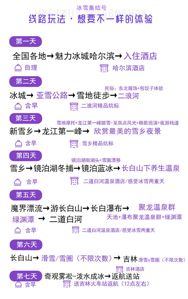 3. 雪乡因条件有限不提供一次性洗漱用品和吹风机,请提前自备。