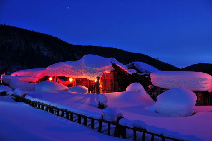 晚上的雪乡还是挺漂亮的,可以去这家旅馆看一看,上面蘑菇屋很漂亮。
