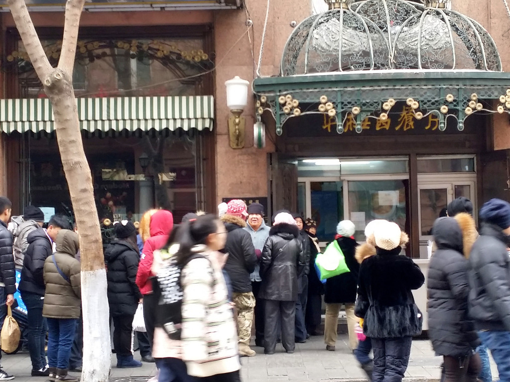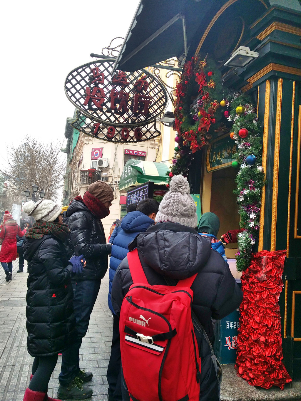 中央大街上比较出名的一个就是华梅西餐厅旁边卖的面包了,等我们来的时候已经有很多人排队了。我们边排着队,边跟前面的大爷唠嗑,大爷说这家的大列巴好吃,每天都会来买。所以我两也就冻的吼吼的在那排队,实在冻的不行,我两就轮流去旁边的有家店里面取取暖,就这样排了好一会才轮到我们,我们买了好几个大列巴,虽然在这之前我们根本不知道大列巴是个啥。拿到手以后才知道,是那种烤的硬硬的面包,不过最终这些面包被我带回去了以后都发霉了也没吃,因为太硬,实在是不知道该怎么吃它,不过这可能就是俄罗斯的面包特色,也算是感受了一把。