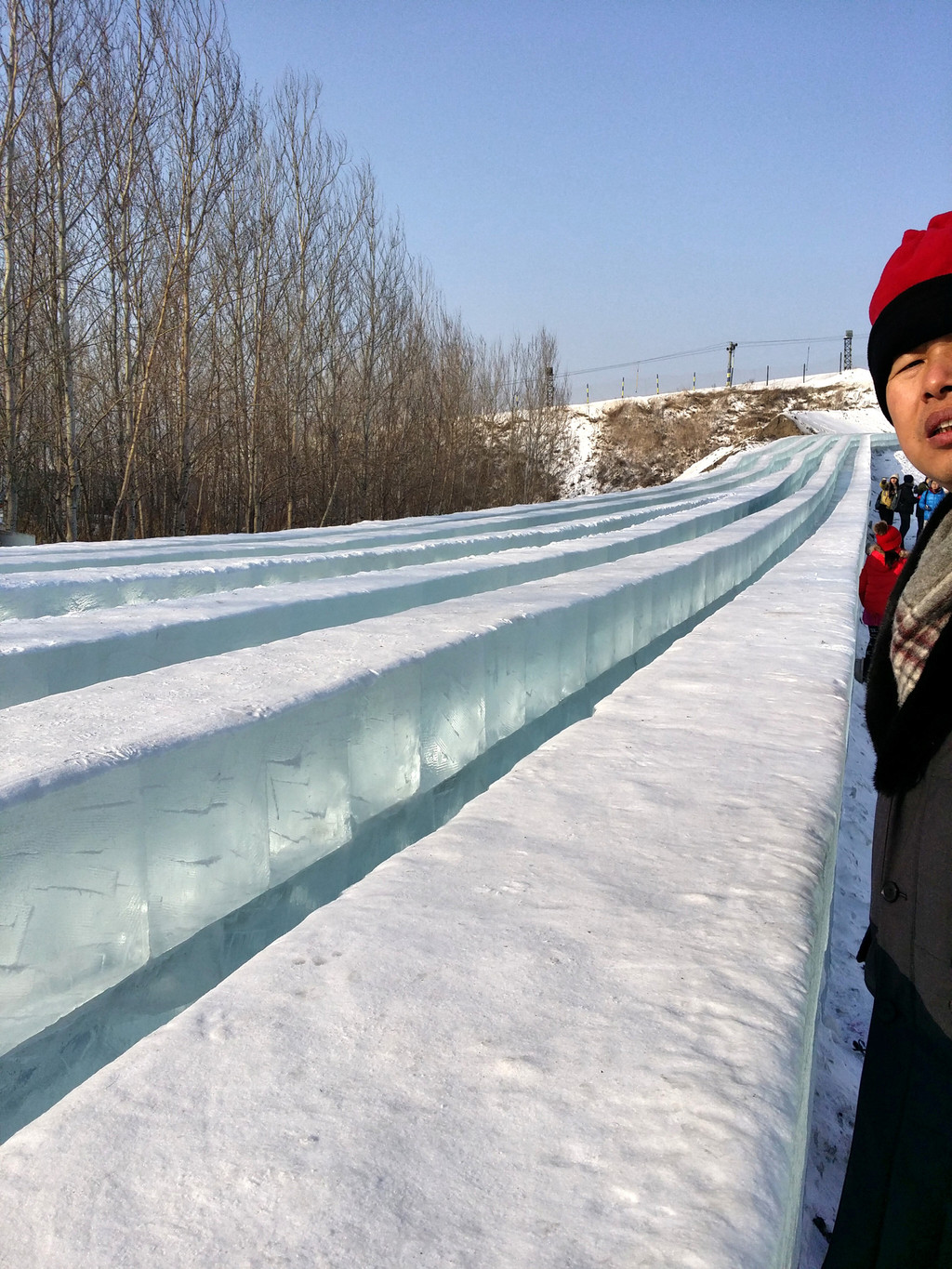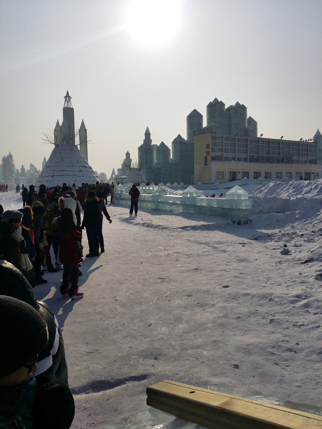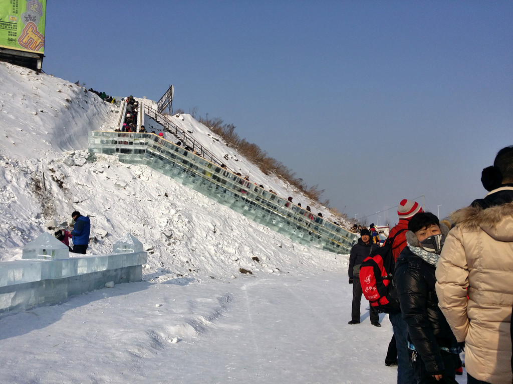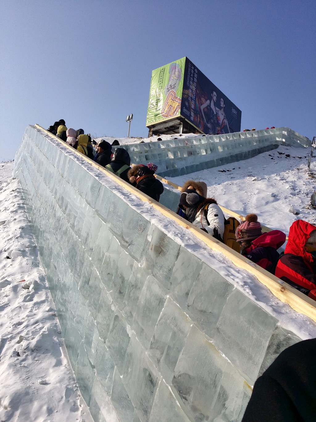 为了玩这个滑冰梯,在那排队冻了两三个小时,默默的把墨镜戴上了,因为怕得雪盲症。冰雪大世界里是真冷,因为里面都是冰,而且在那排队也是寒风凌厉,不过为了玩项目也得坚持坚持。