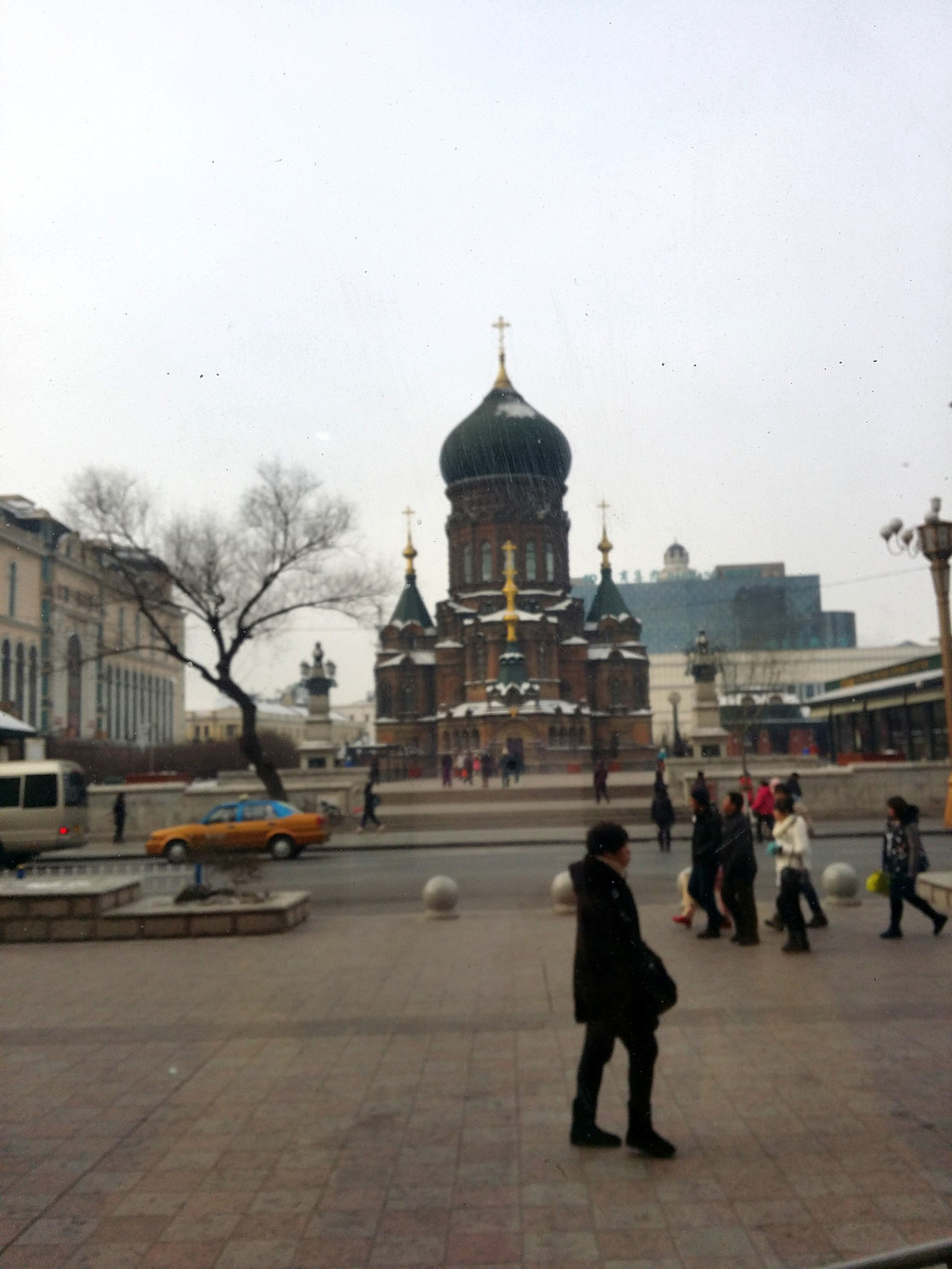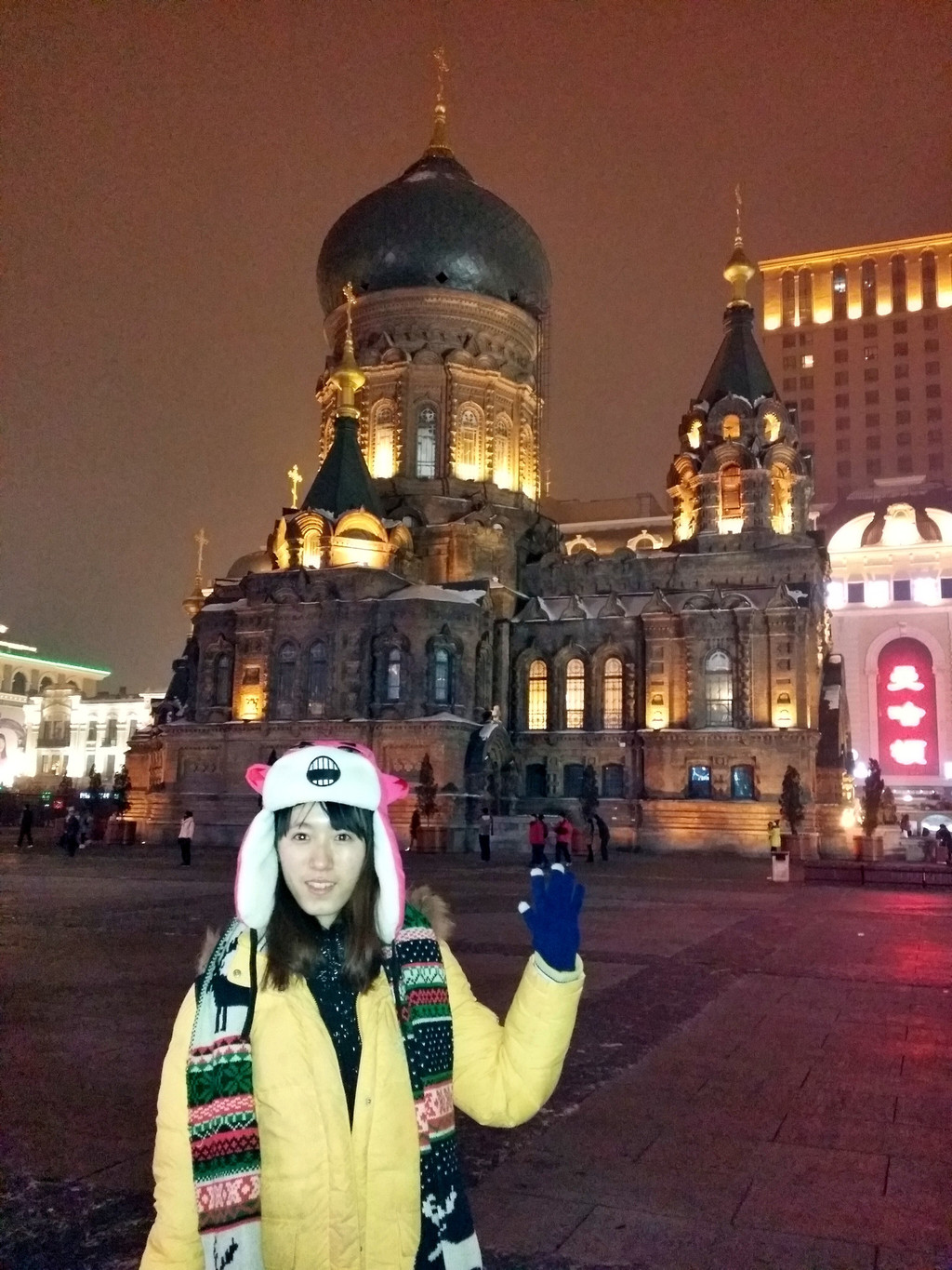 再往前走就是松花江,江面上结了厚厚的冰,很多马、车在上面跑,我上去溜了两圈,可以说没有一步是能好好走的,在中央的大街买的雪地靴反而特别滑,走一步摔一下,摔的在冰上打圈,哈哈哈,幸亏衣服穿得多,还不是太疼。