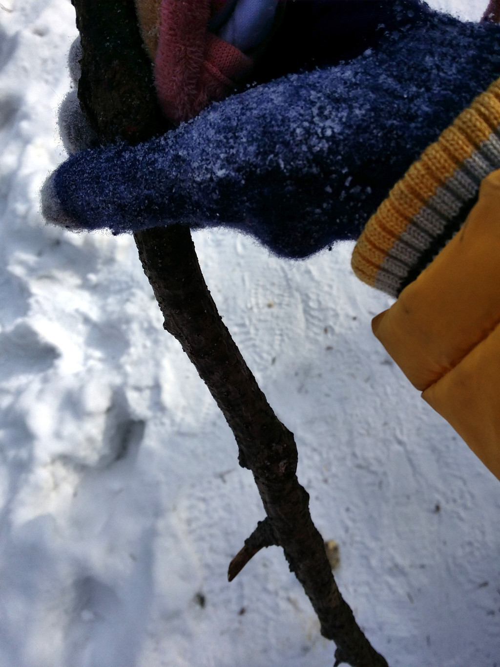 路上不断的捡树枝,来当拐杖,这样减少摔跤次数。