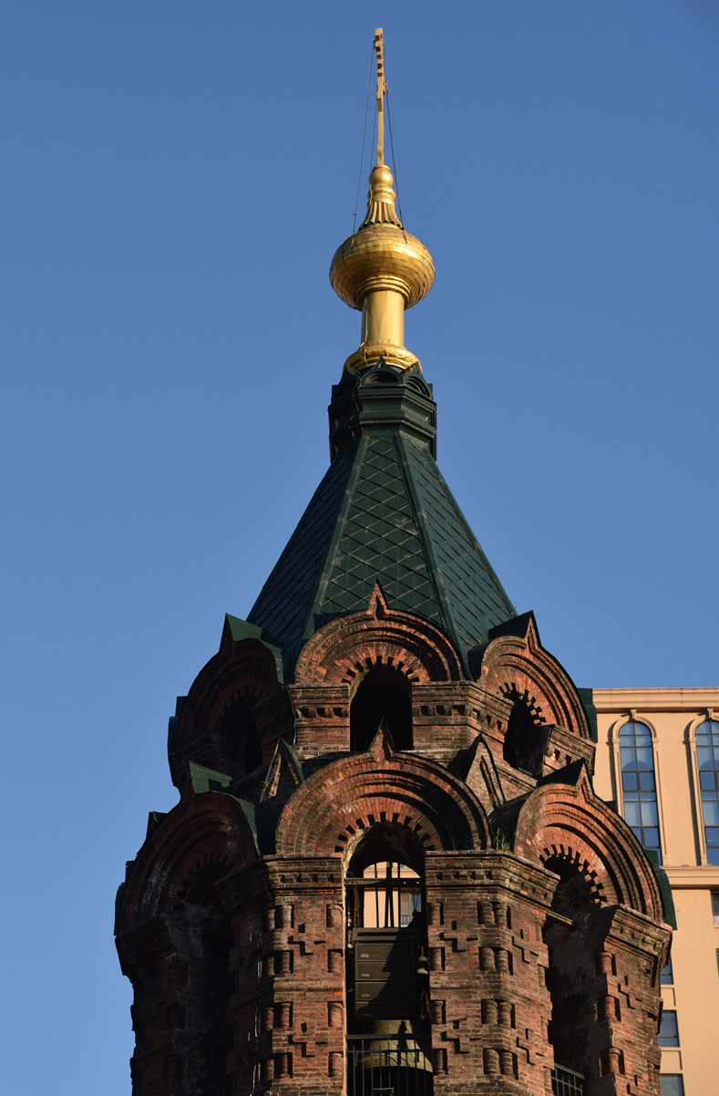 圆鼓座顶部是具有俄罗斯风格,巨大饱满的洋葱头穹顶,给人以耸入云宵,蓬勃向上的想像空间。金黄色的十字架,绿色的主穹顶、小帐篷顶,与红色的墙体互相映衬,使教堂愈发显得典雅气派、宏伟壮观,充满着异域的风情。