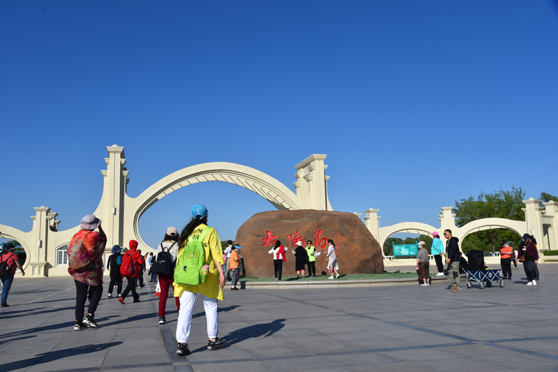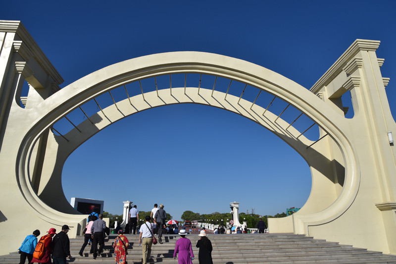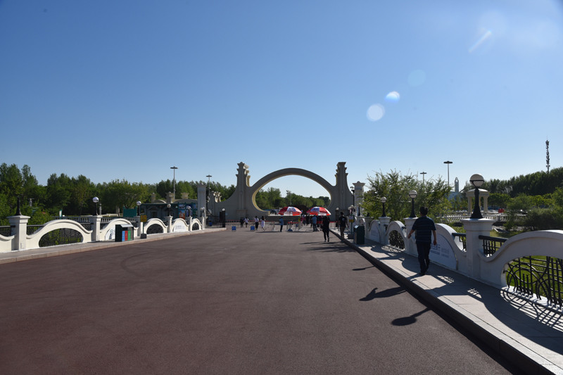 来到太阳岛公园,只见一块巍然耸立的深红色景观石上书有“太阳岛”三个大字,为赵朴初先生所题。再往前走是一大四小、共五个椭圆拱型门相连组成的“太阳门”,色彩洁白无瑕,造型新颖别致,极具空间感、纵深感和时代感。