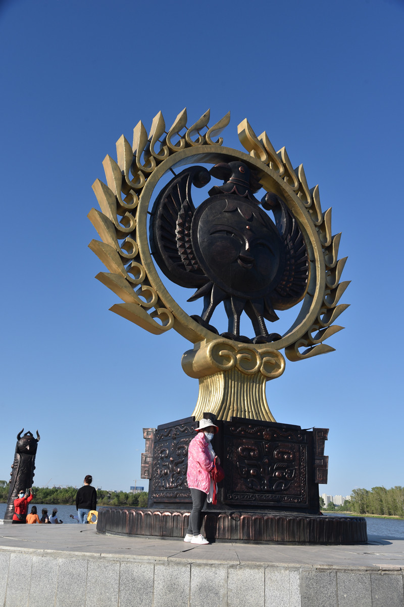 太阳岛第一景“水阁云天”也没机会去,只在浴日台作短暂停留。这个太阳神台两侧的浮雕,讲述了“后羿射日”这个远古的神话故事,圆形台的中心雕塑表示为现在天上的太阳,周围的九根立柱雕塑喻意为后羿射下来的九个太阳。