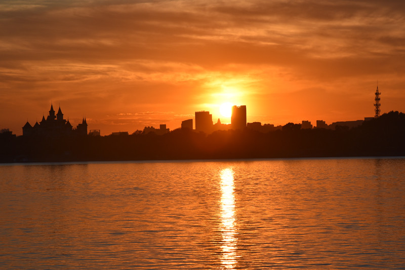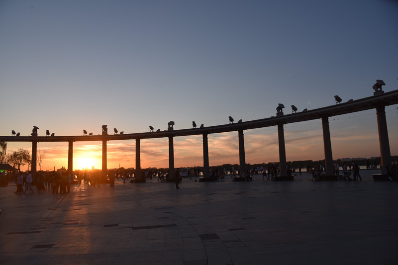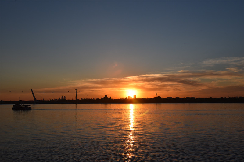 走到防洪纪念塔,与落日不期而遇,半圆形回廊上的灯座好像一只只鸟儿,夕阳的余晖给抗洪英雄增光添彩,夜幕下的哈尔滨魅力迷人。迎着落日走去,来到松花江边,凭水临风,极目远眺,对岸的太阳岛静静地等候太阳回家。