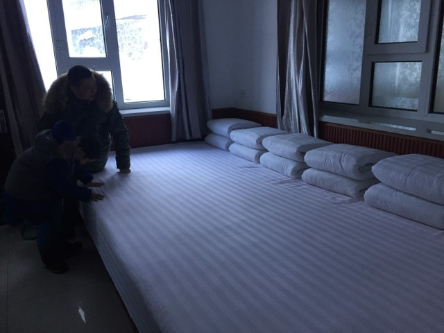 雪谷和雪乡的房间分配别具特色,由于是旅游旺季,宾馆房间比较紧张,所以不论是不是一家人,是不是一个旅行团,都遵循一个分配原则,引用导游的话就是“男男住,女女住,男男女女分开住”。所以强烈建议自驾游的朋友一定要提前预定住宿问题。