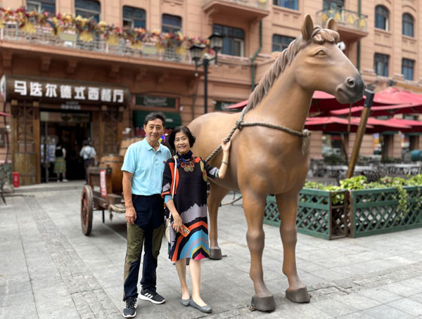 漫游中央大街观赏这里的欧式建筑,其中的马迭尔宾馆特别抢眼。特别是门前有着一匹大马拉着葡萄酒桶的景观,吸引着众多游客在此拍照留影。