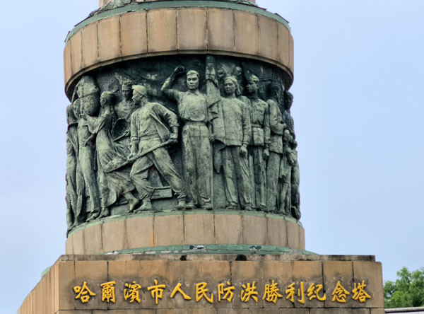 防洪纪念塔全称为哈尔滨市人民防洪胜利纪念塔,它的后面就是松花江。上世纪的1957年哈尔滨遭遇特大洪水,全市人民与驻地官兵共同努力战胜了洪水,于1958年建立此塔以志纪念。纪念塔为圆柱体,塔高22.5米,塔身以浮雕方式描绘了当年战胜洪水的生动情节。