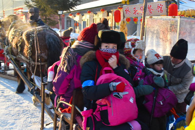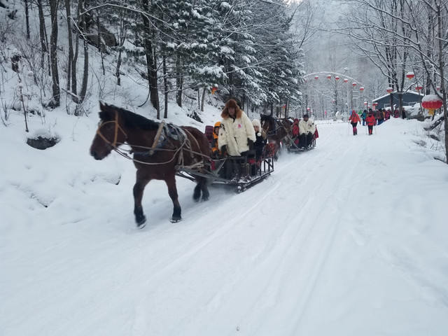 第三天早上7点-8点是穿越雪乡的时间。跟着大部队爬山15公里,我自己知道体力不好,提前订了马车,叮叮当当的一路很顺利。
