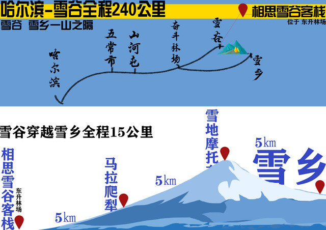 1.早晨6点中央大街附近集合发车,车程约4.5小时,一般是道里东七道街和东八道街附近上车,11点左右抵达雪谷客栈。价格参考:100/人,PS:元旦春节会上浮。