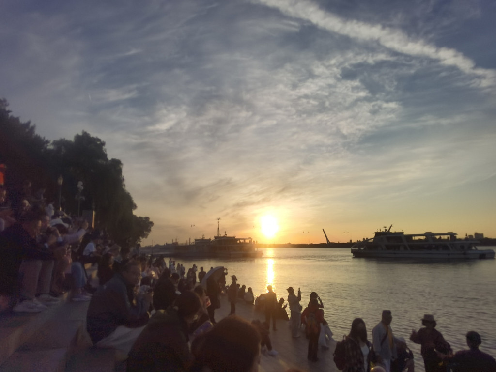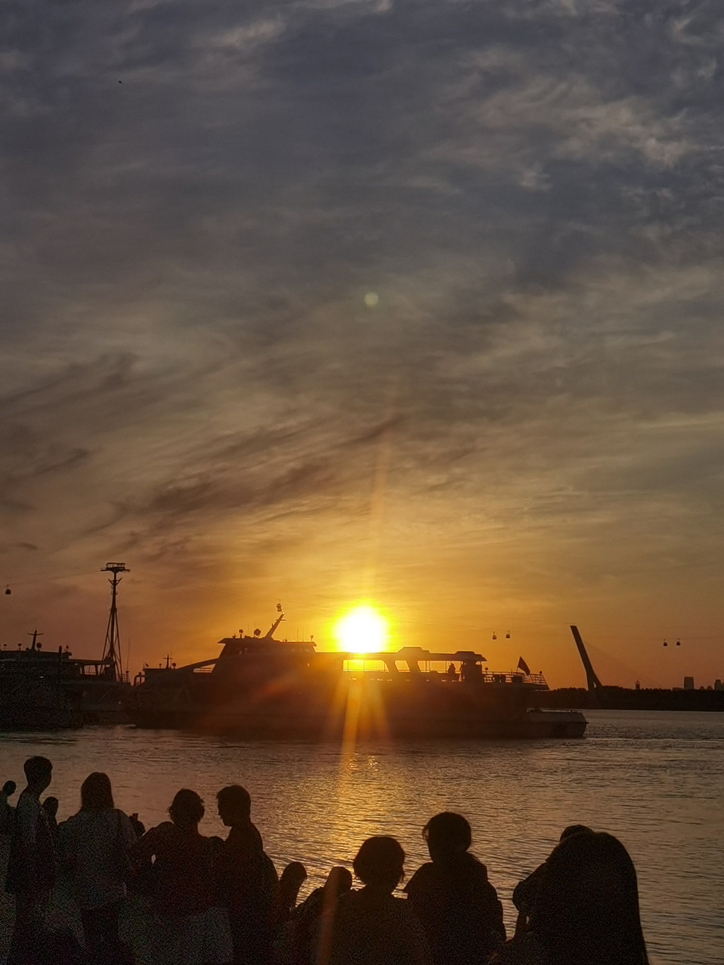 5点我们到了松花江边看夕阳西下,海鸥飞翔,轮舟竞渡,游人如织…
