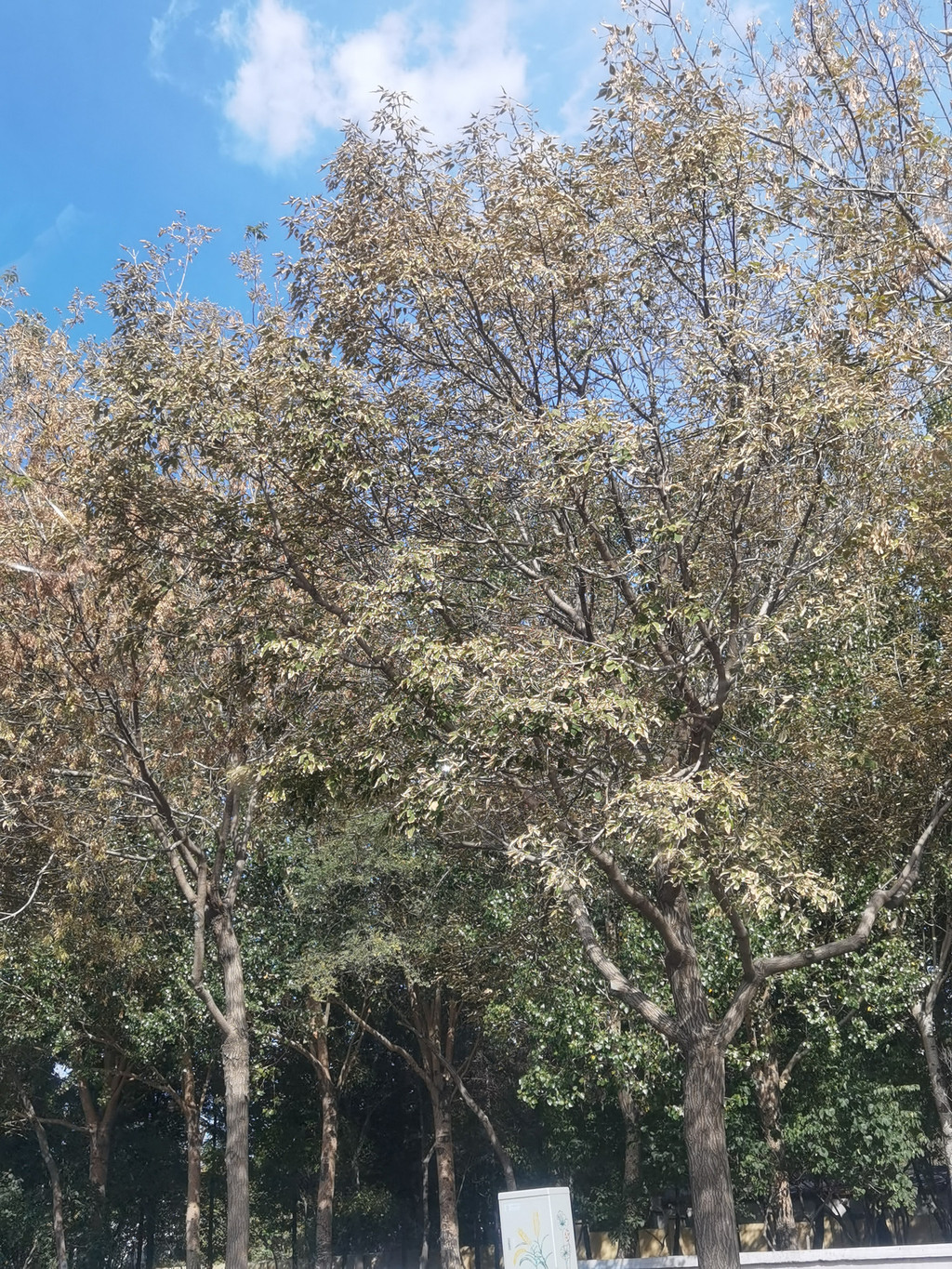 路边行道树有的叶子还没有变色,就已经干枯了。
