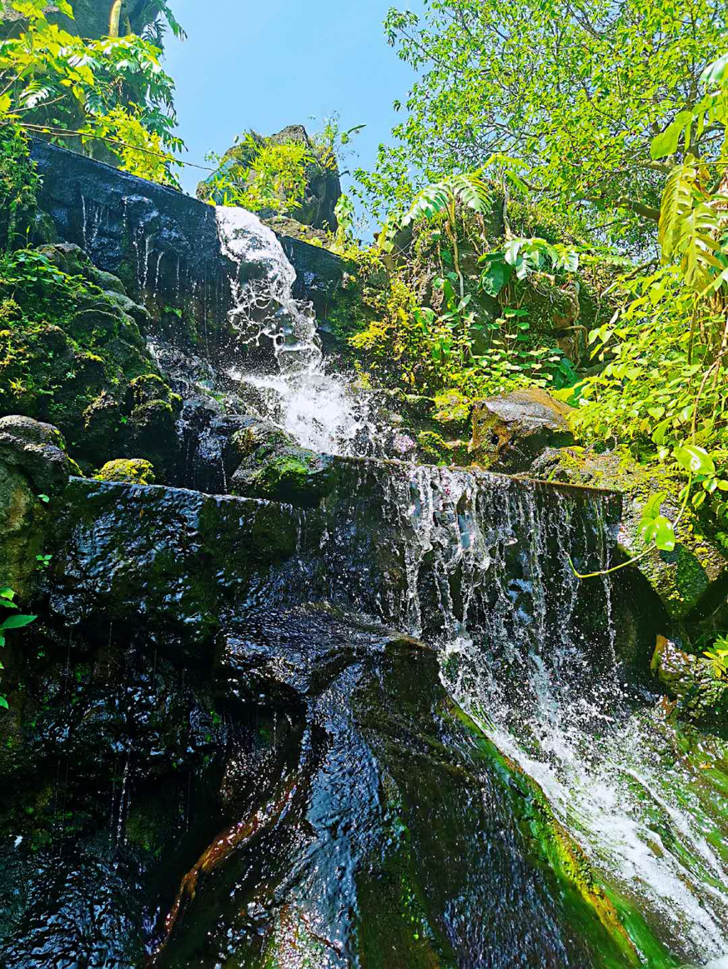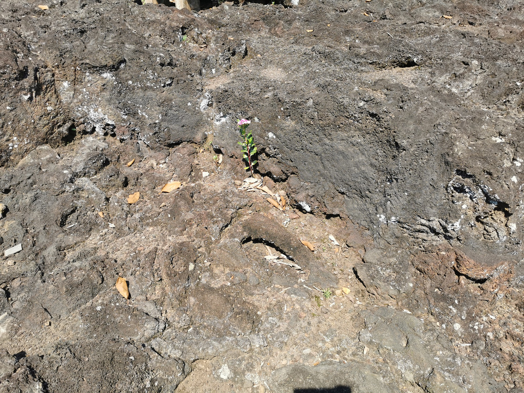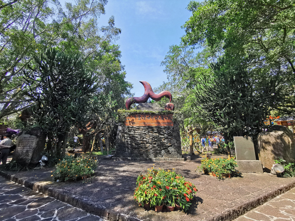 整个公园的路面都是用火山石砌成的,这些石头颜色乌黑、有气泡、呈蜂窝状,让人有种想脱掉鞋子走在上面的冲动。沿着火山石铺就的道路向火山口进发,先经过的是风景怡人的火山生态广场,这里有一座被槟榔树环抱的火山根艺园,里面的根雕千姿百态,我以为是艺术家的杰作,看过介绍才知是大自然的天然艺术造诣。
