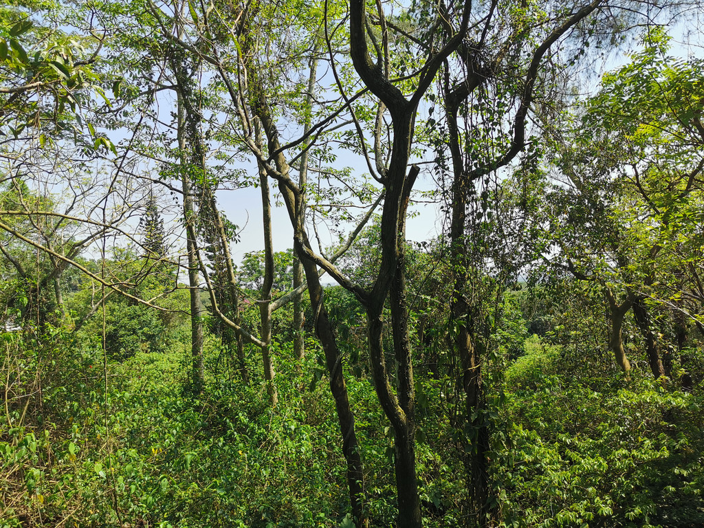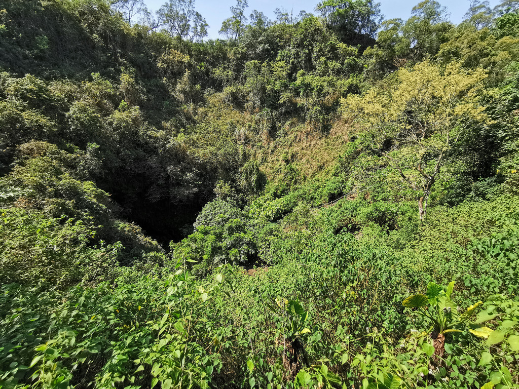 从小石庙再向上攀登,很快就到了马鞍岭火山口的边沿,从这里向下望去,才知道所谓“火山口”其实是一个直径有1000米、深达90米、呈漏斗形下陷的大坑,坑里植被茂盛,生机勃勃的藤蔓掩盖了周围峭壁之上火山爆发遗留下来的原状熔岩,也阻隔了从山顶之上探究坑底的好奇目光。