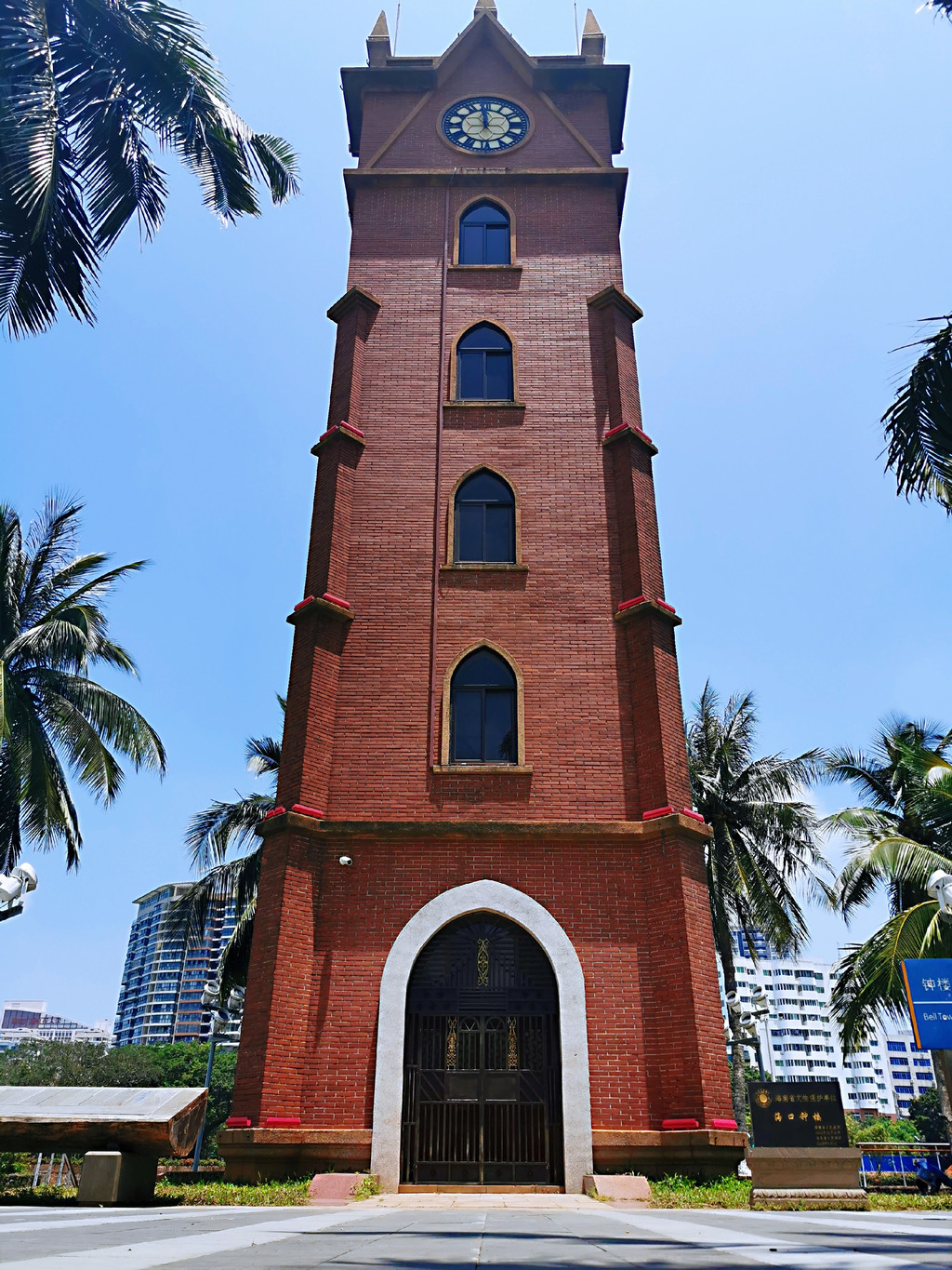 海口钟楼历史悠久,兴建于清末民初,当时作为对外口岸的海口,商贸活动十分繁荣,但当时全市还没有一个统一标准的计时设施,给人们的生活带来不便,于是爱国商人周成梅发动海外侨胞捐款集资建立了一个大钟楼。现在在我们眼前的,是1987年改建的,采用了先进的电子时钟,以保证报时准确不误。如今,海口钟楼已成为海口的最重要的标志性与象征性建筑物之一。红砖色的建筑主体很多人眼球,与四周葱绿的椰树十分相称,再加上临水天又蓝,色调简直太好看了!