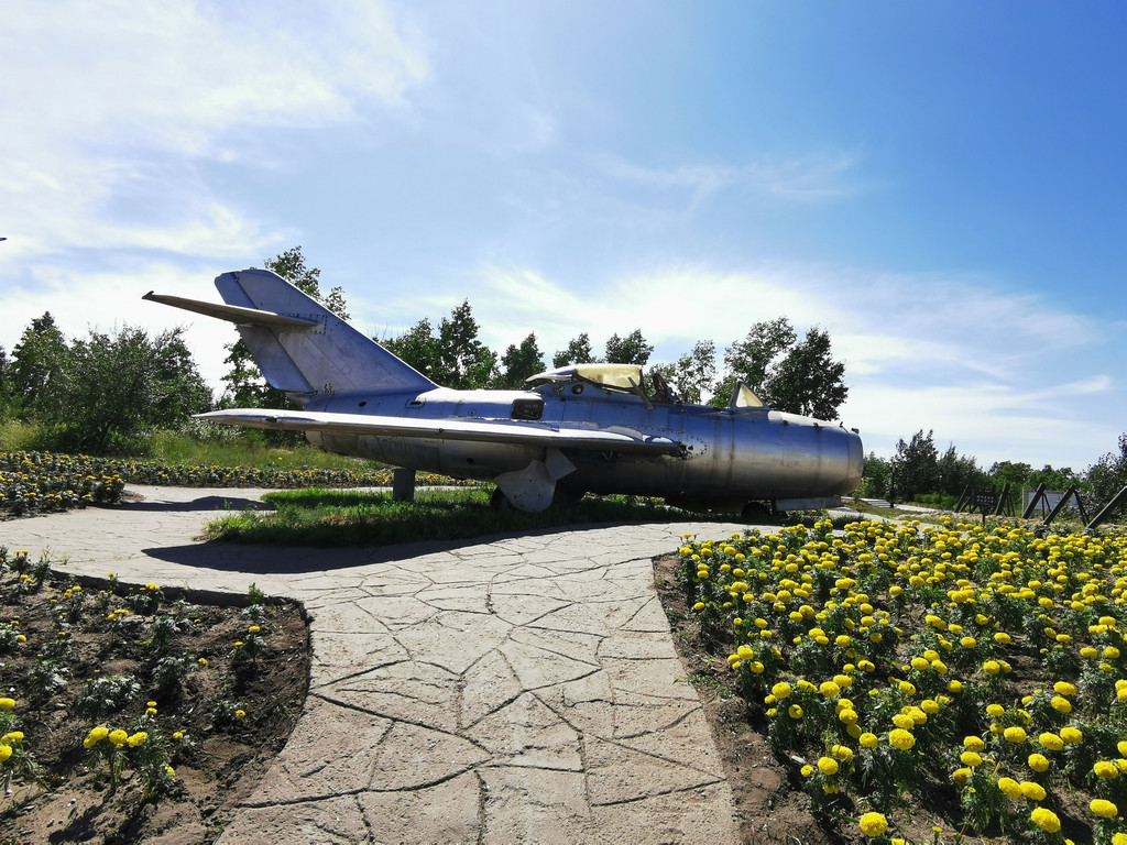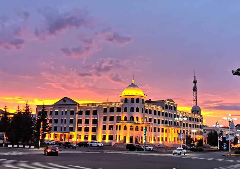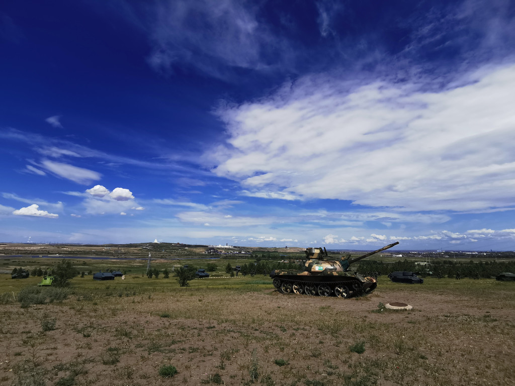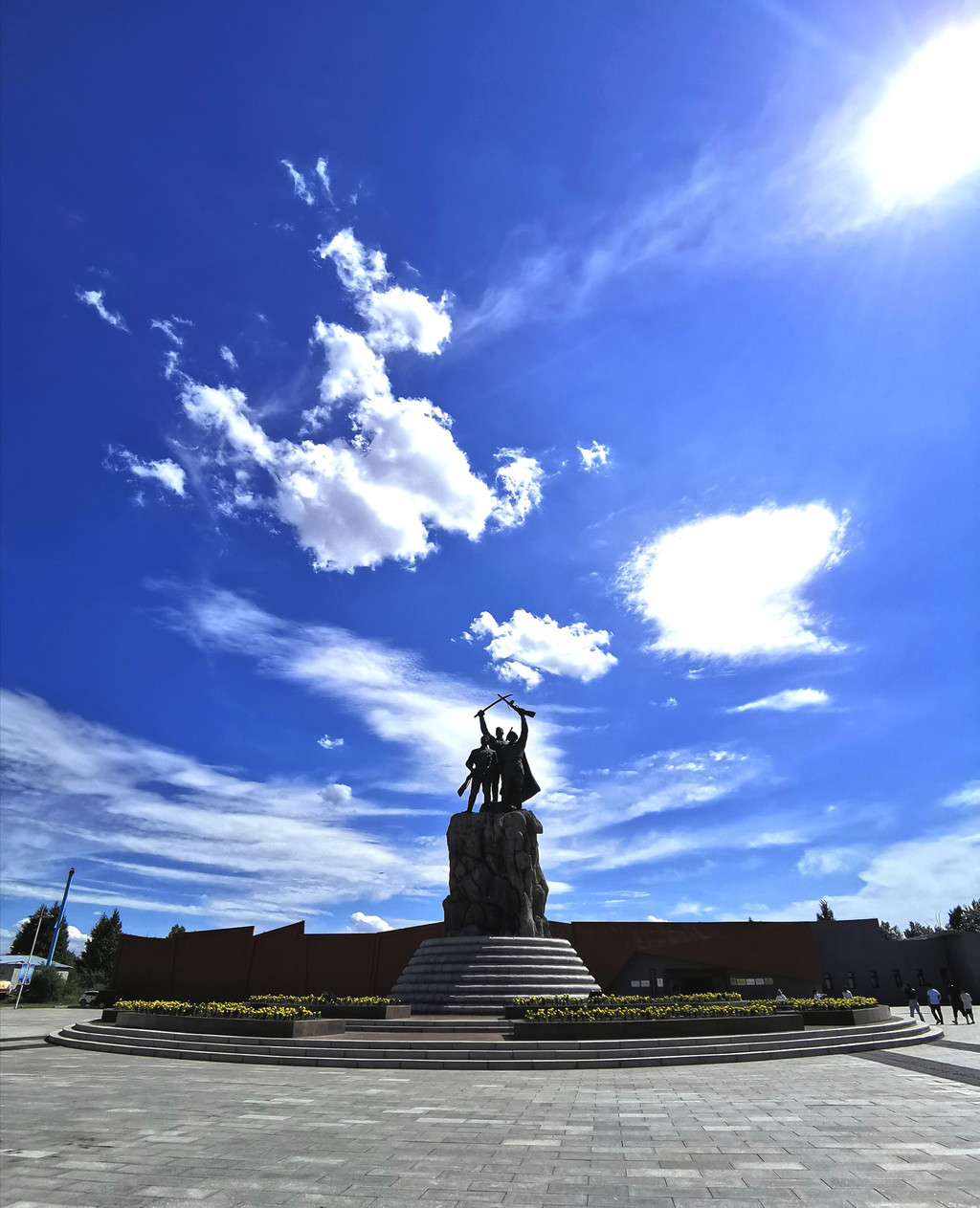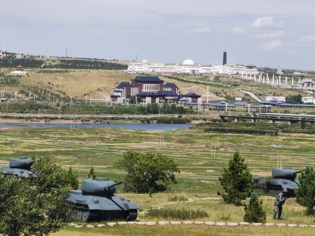 世界反法西斯战争海拉尔纪念园,从入园处眺望对面的敖包山,高大宏伟的建筑群便是达尔吉林寺和慈积金刚塔。
