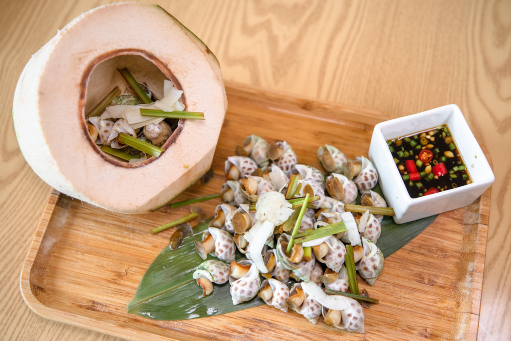 椰香花螺是三亚十大名菜,其将花螺的鲜和椰子的清甜完美结合。