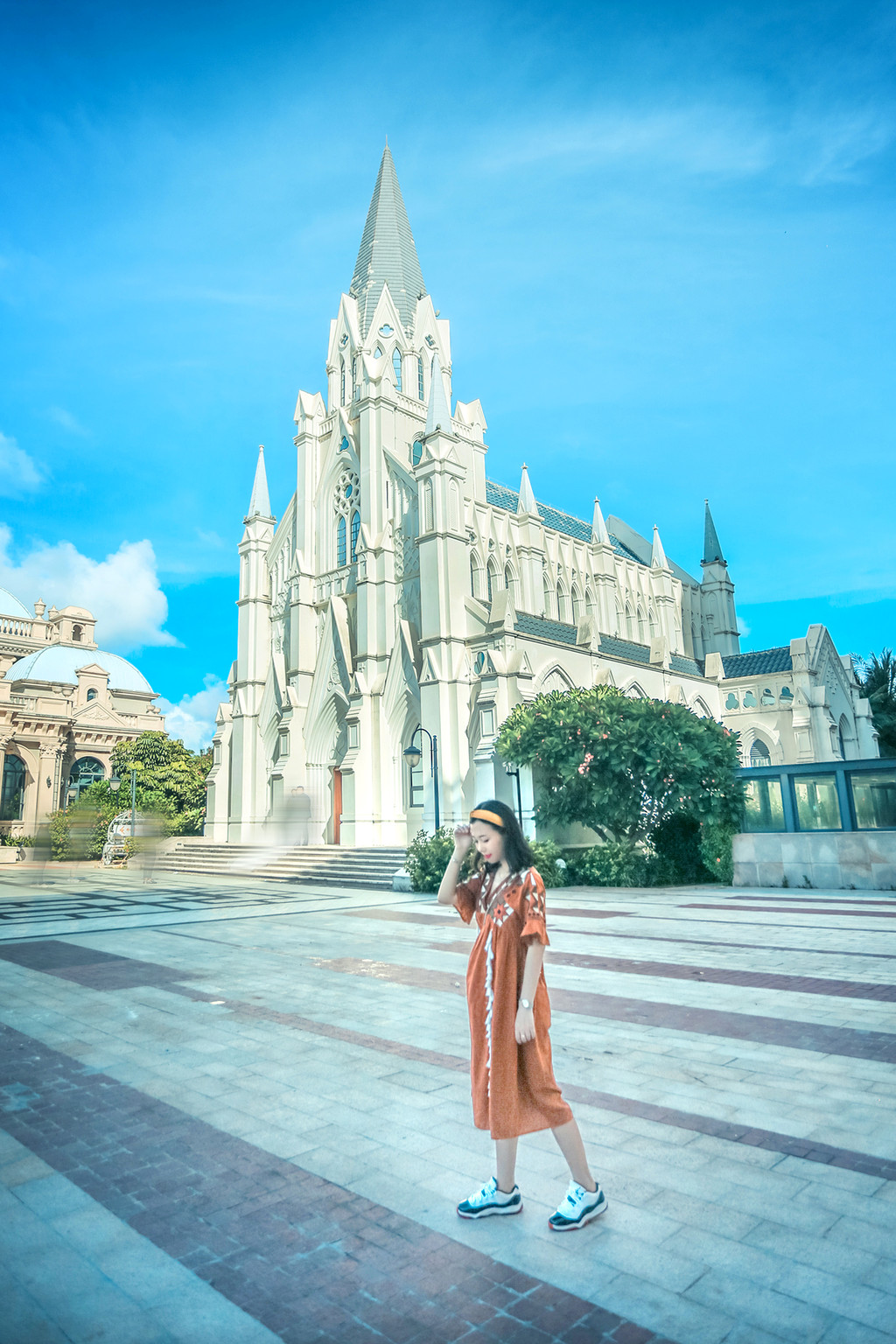 站在教堂内部,用大广角拍摄,让教堂的三角形构造充当画框,背景是 三亚湾 的美丽海景,这真是一个出片的好地方。