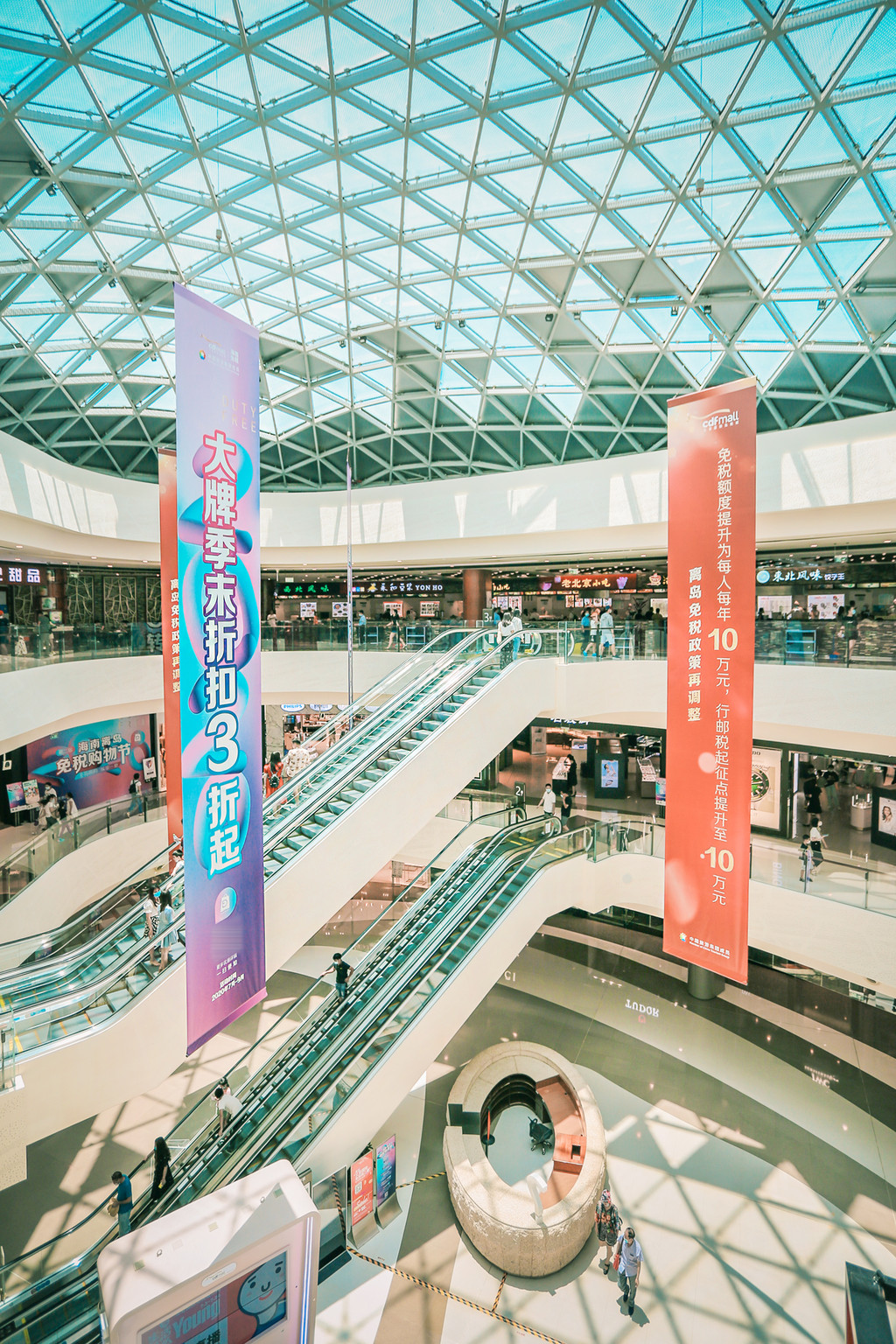 免税城的室内部分,结合了商业购物的五感,即视觉、声音、气味、触摸、品尝。整体项目设计为“海、棠、花、海中瑰宝及大自然”五个主题馆,带给游人丰富的购物享受。