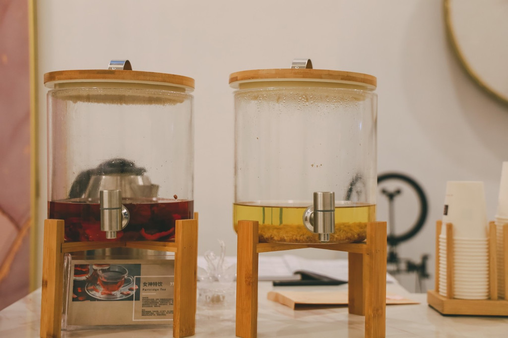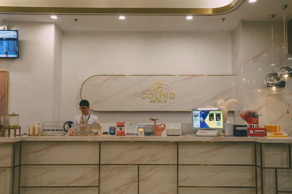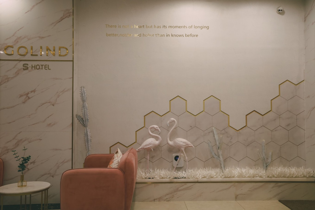 1.大堂的粉色系设计,配有茶水。酒店人员身穿校园服,迎面而来的青春气息,老娘撩发少女心啊
