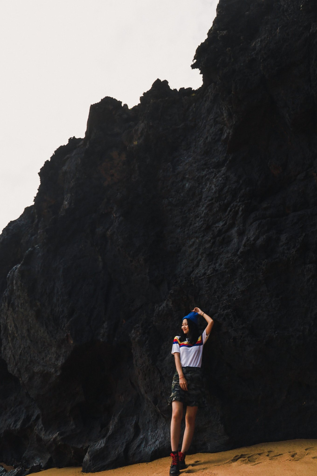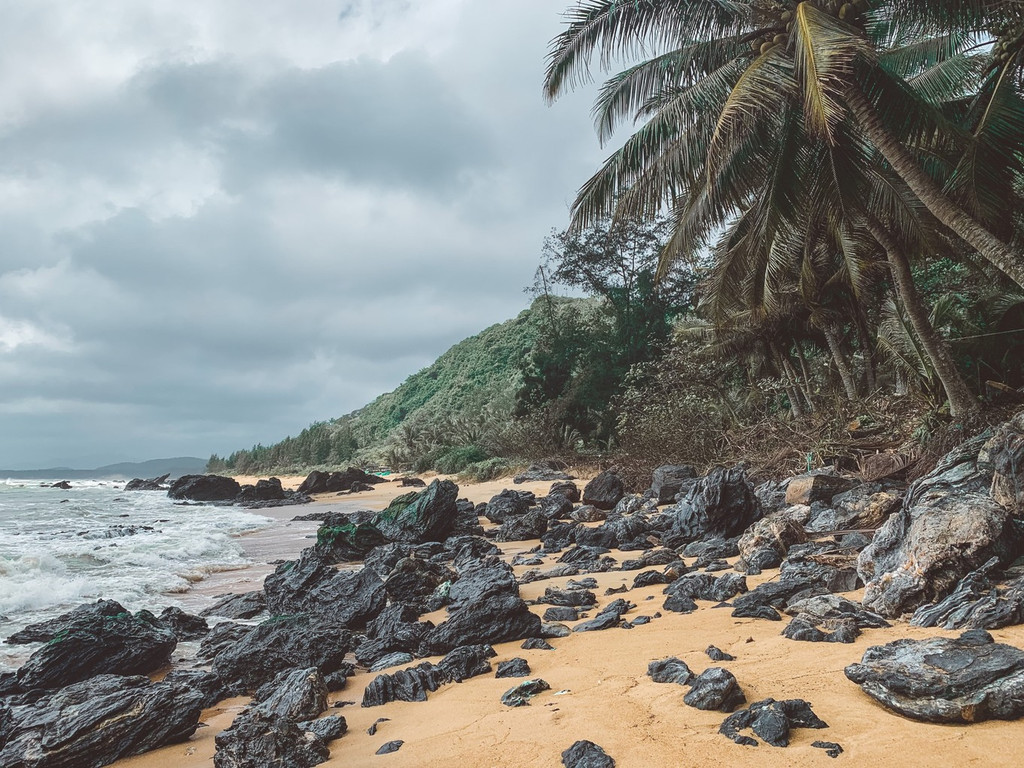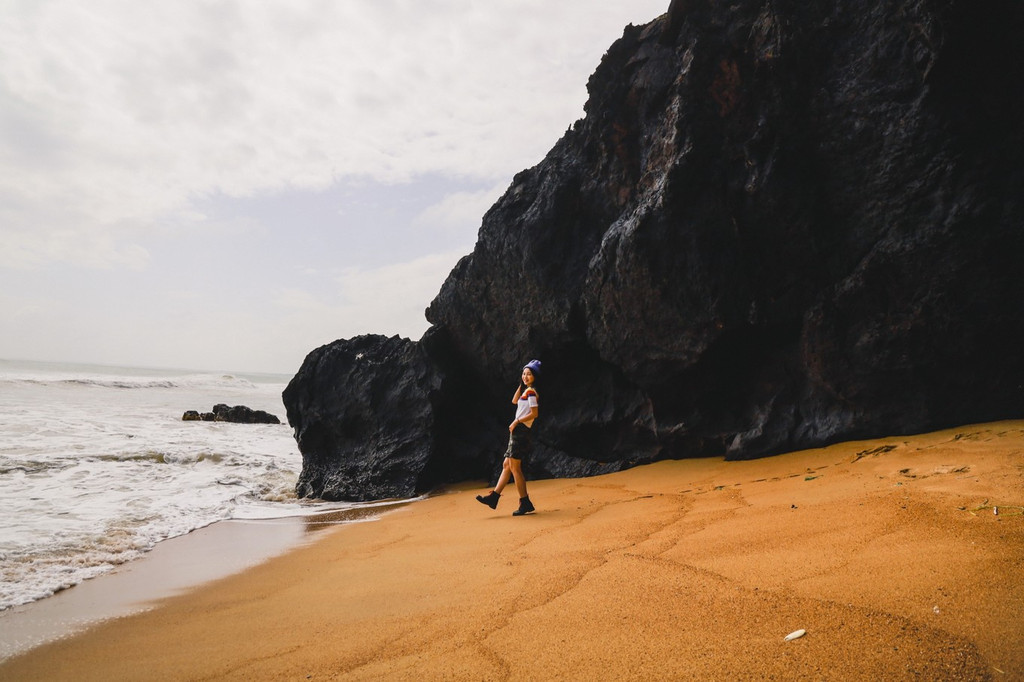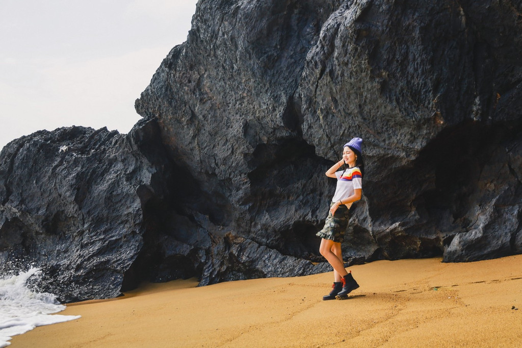 下车后,一位大叔说要不要坐他的三轮车下车,下面很远的要走半个小时。他不知道 广东 女汉子不需要车,自己找的洞爬着也要过去。没有坐车是对,这段路一直都是下坡路,坐车可能更害怕啊,走5分钟走到逐渐看到海边,黑礁石若隐若现,树影斑驳,一路小阴走到了一个饮料补给的小木屋。你可以停下来休息,或者继续往海边走。这些参差不齐的礁石,穿着拖鞋真的很难走,光脚也痛,庆幸我穿了战斗靴,防水不怕滑,畅通无阻。