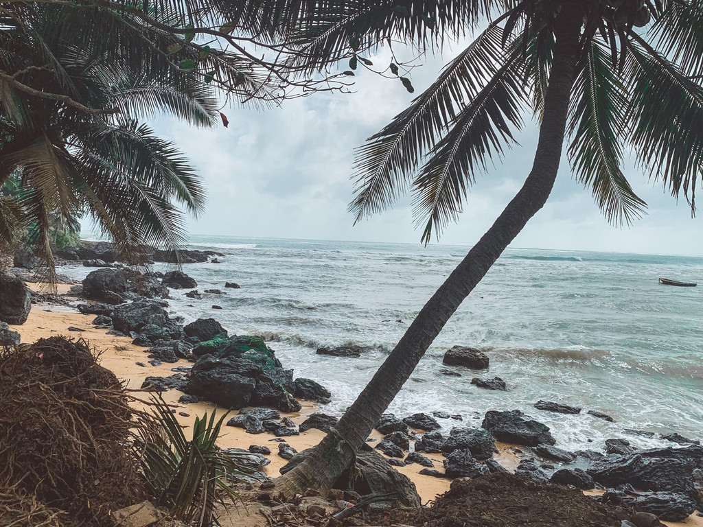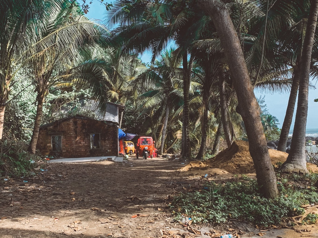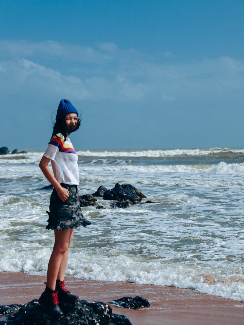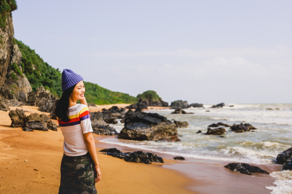 下车后,一位大叔说要不要坐他的三轮车下车,下面很远的要走半个小时。他不知道 广东 女汉子不需要车,自己找的洞爬着也要过去。没有坐车是对,这段路一直都是下坡路,坐车可能更害怕啊,走5分钟走到逐渐看到海边,黑礁石若隐若现,树影斑驳,一路小阴走到了一个饮料补给的小木屋。你可以停下来休息,或者继续往海边走。这些参差不齐的礁石,穿着拖鞋真的很难走,光脚也痛,庆幸我穿了战斗靴,防水不怕滑,畅通无阻。