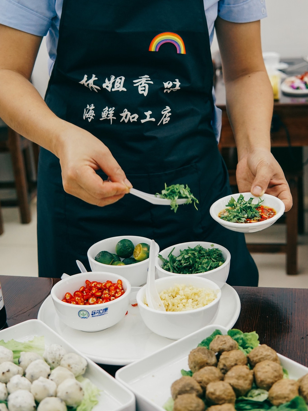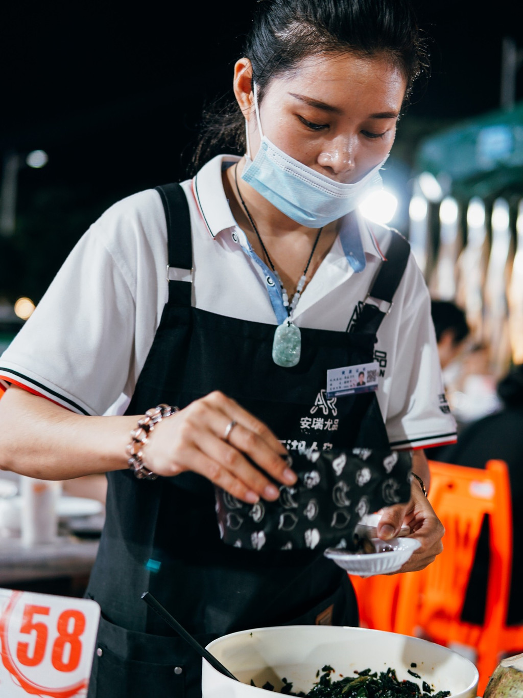 日常羡慕小学生放学就有好吃的,游客的我们站在别人工作的小窗口日常表示不知道如何点单操作,只看到里面流水式工作,很快一份又一份地美味出炉。站了好一回,好心阿姨提醒说,自己找位置坐。我们环视四周发现都是座无虚席。“前面没有,后面还有。”我们寻着阿姨的手方式走去,大排档式人间烟火感来了,自来熟的拼桌。