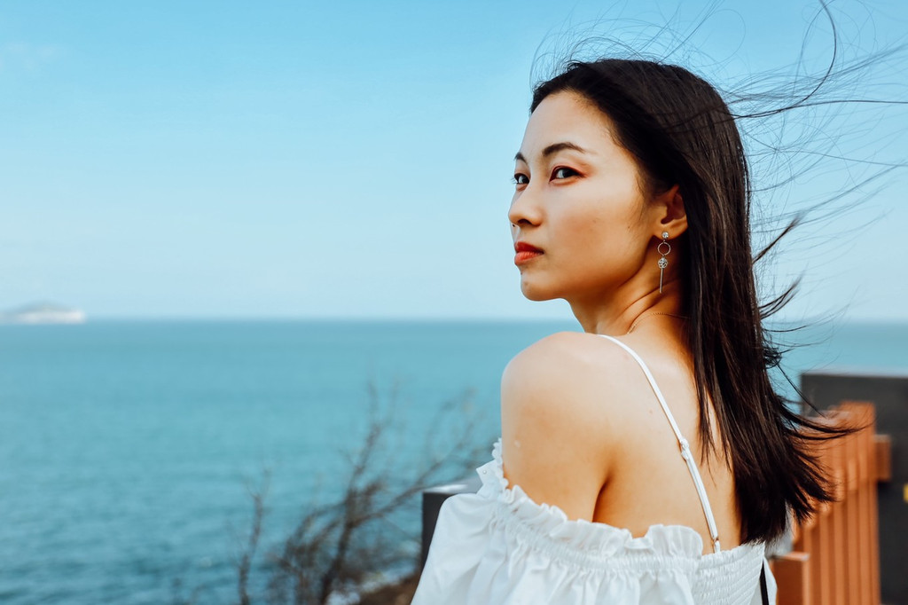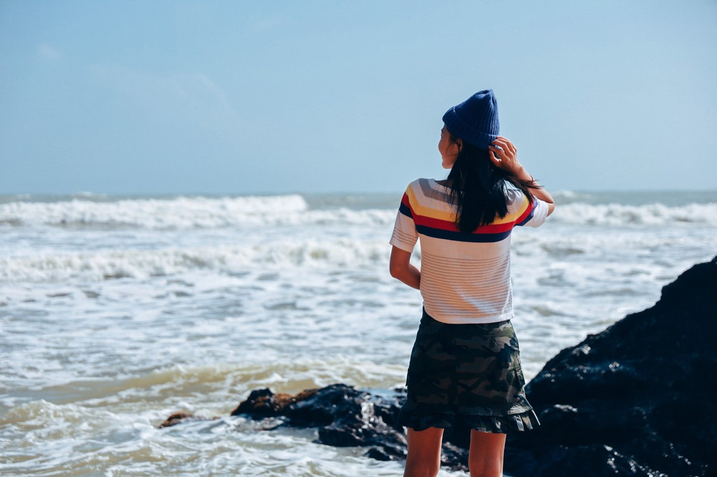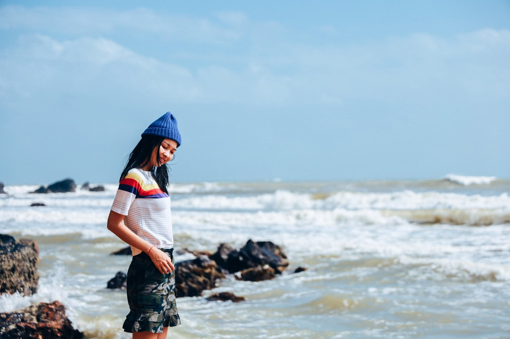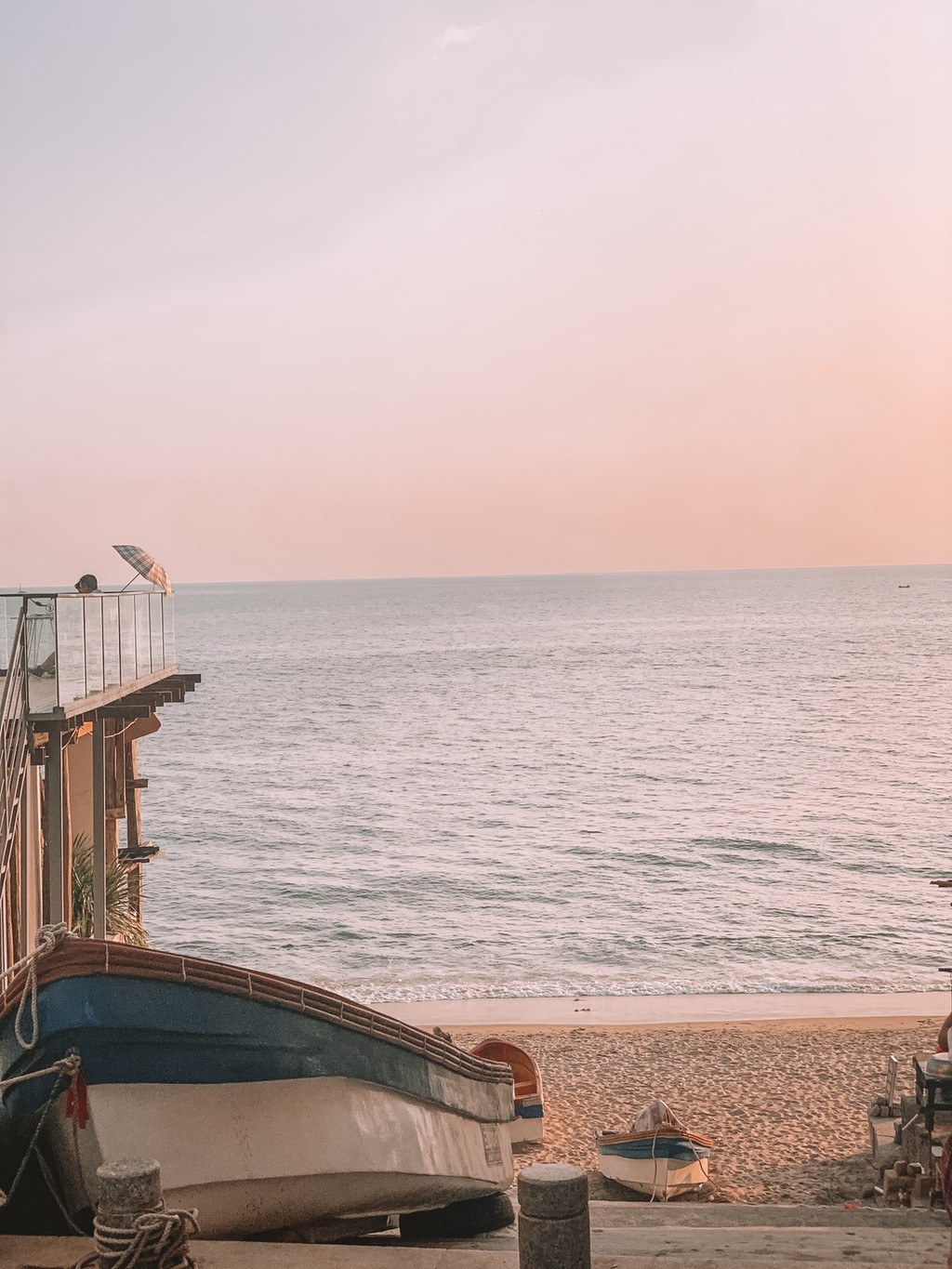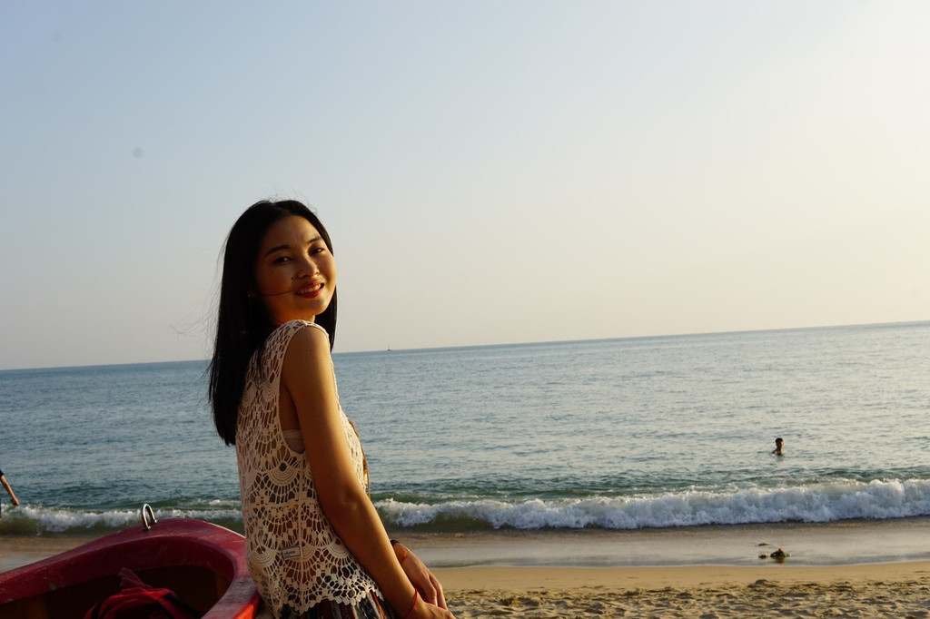 在岸边的小船只上吹风的我,任由海浪呼啸,我只想听听游人追逐的快乐