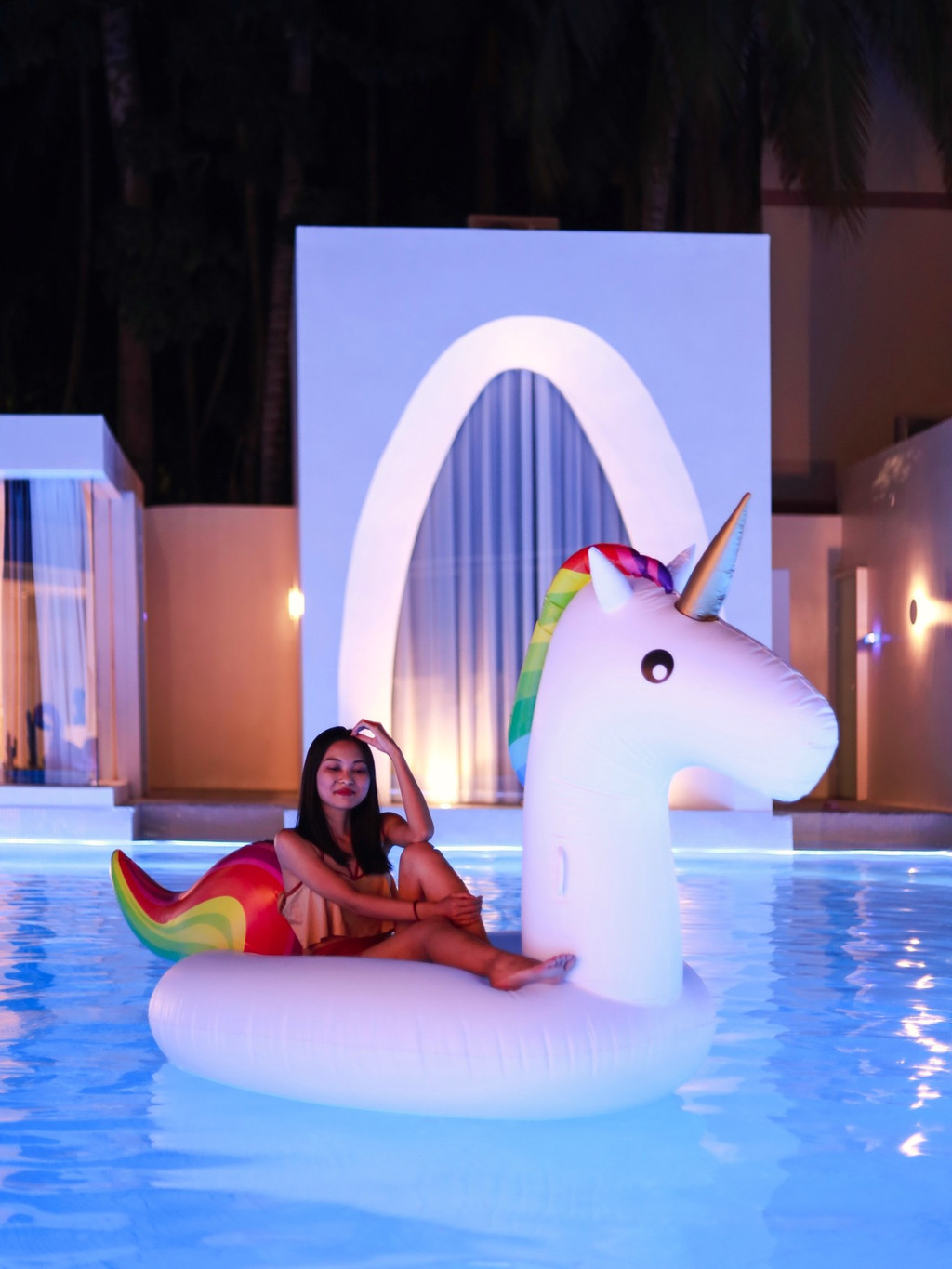 三亚 白天还真的是?火辣辣,还好定了这个民宿,让我夜里回到民宿,拥有一个暖畅玩的家。直接在房间换好泳衣就下水游玩啦,各种水上网红道具,独角兽泡泡圈/玻璃船/天使的翅膀,不会游泳的人也可以有自己一片玩玩乐的天地?