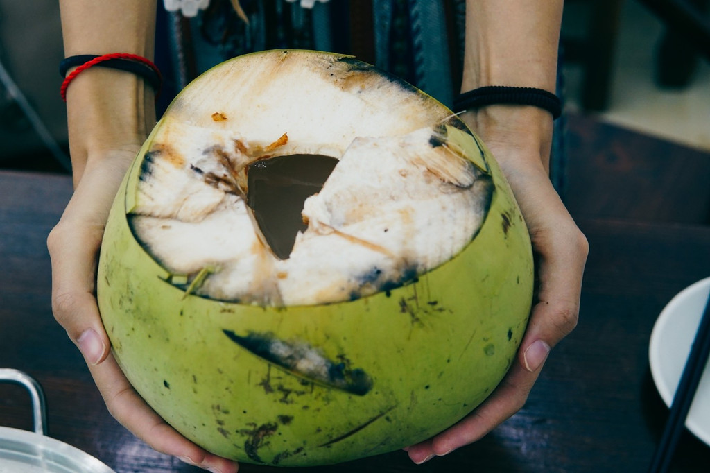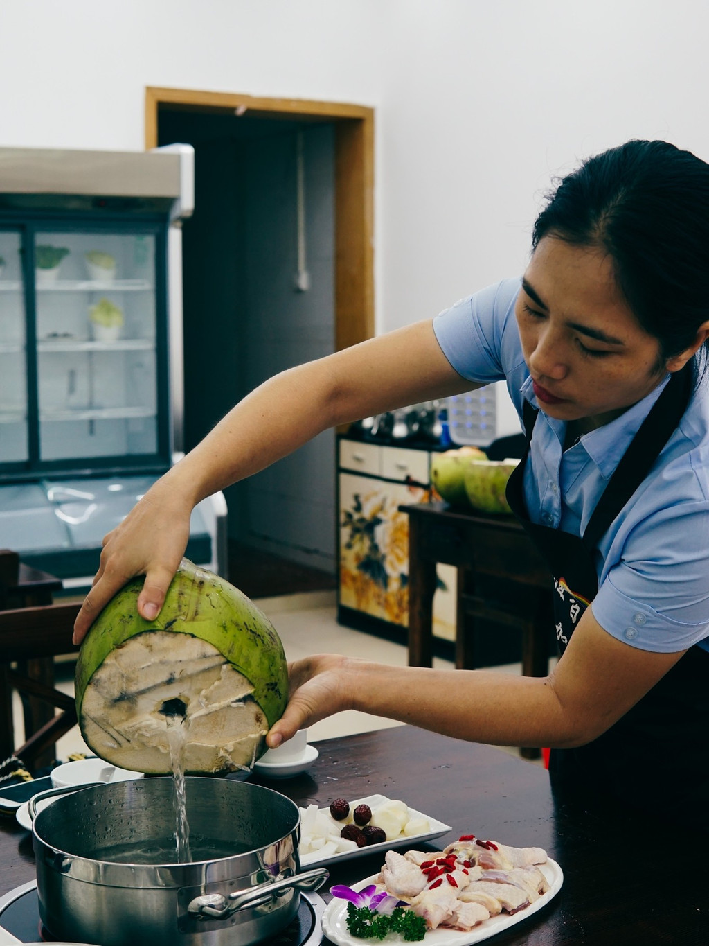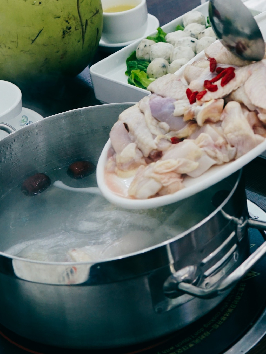 三个椰子水都超级饱满的,倒了足足有30多秒,阿鸡还没煮熟前就非常肥美,我们顾着拍照发朋友圈