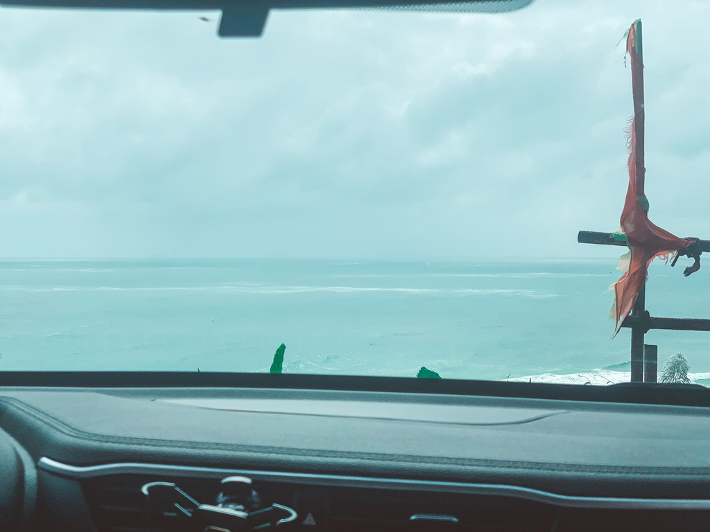 这一天并没有因为下雨而结束了,我们继续向着日月湾出发,追风的女孩终究还是等到来它的雨天,号称 三亚 - 万宁 最美海边公路日月湾,我们还是没有遇见它的最美的时候~导航到达目的,我们向右开了一段路,速度非常非常慢,绵绵般的雨划过车窗,拍过浪,是到此一游,也是一种遗憾,那一次再见~