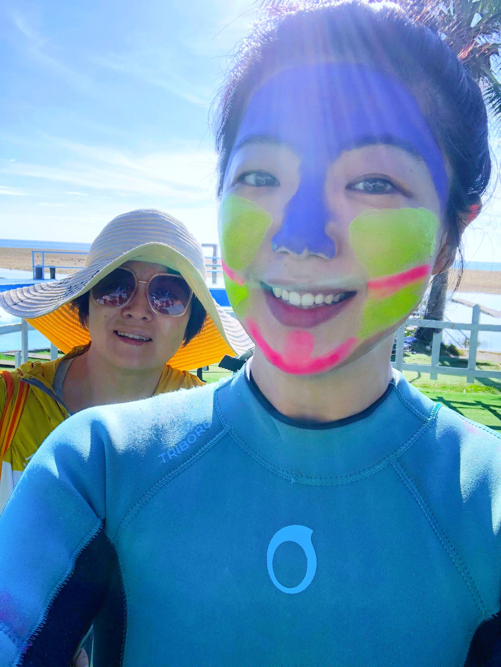 店家贴心的准备了彩色的防晒霜,可以自己DIY自己,结果老王一转身,给我妈笑了一个跟头,这个粉红脸蛋儿是怎么回事哈哈哈哈哈哈!