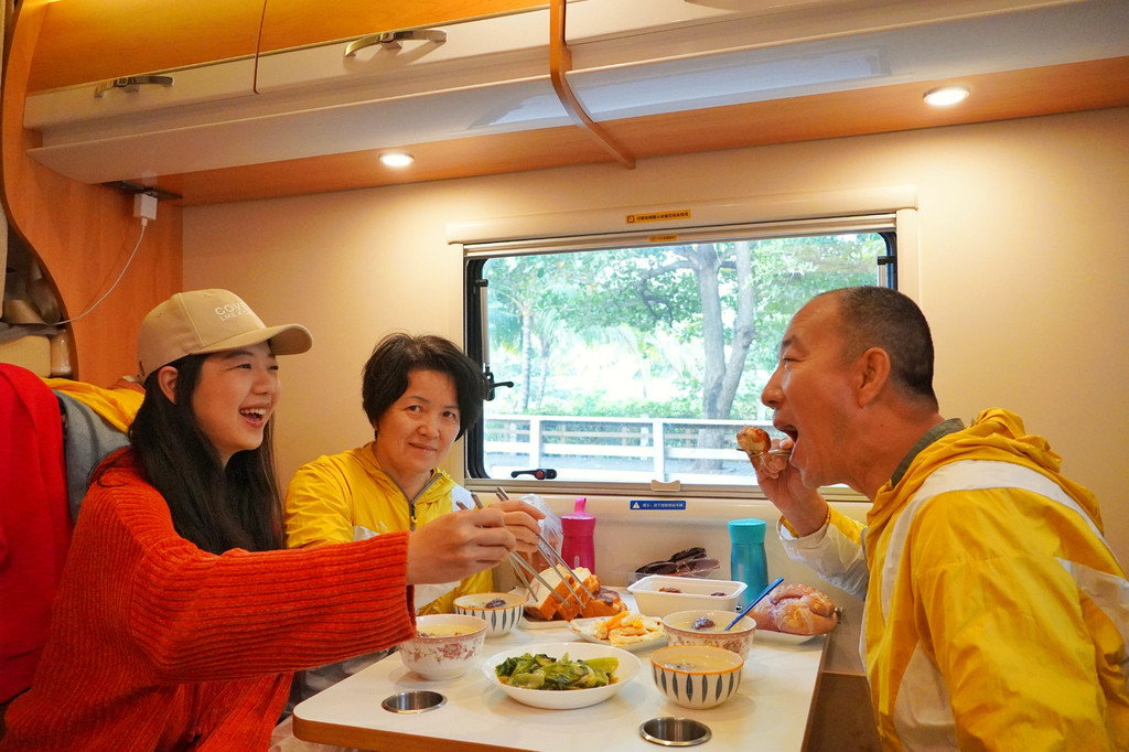 老爸对房车的使用已经特别娴熟,快速的撑起遮阳棚,老妈帮我烧开冲咖啡的水,慢慢的切好路上买来的水果,一家人不急不慢。