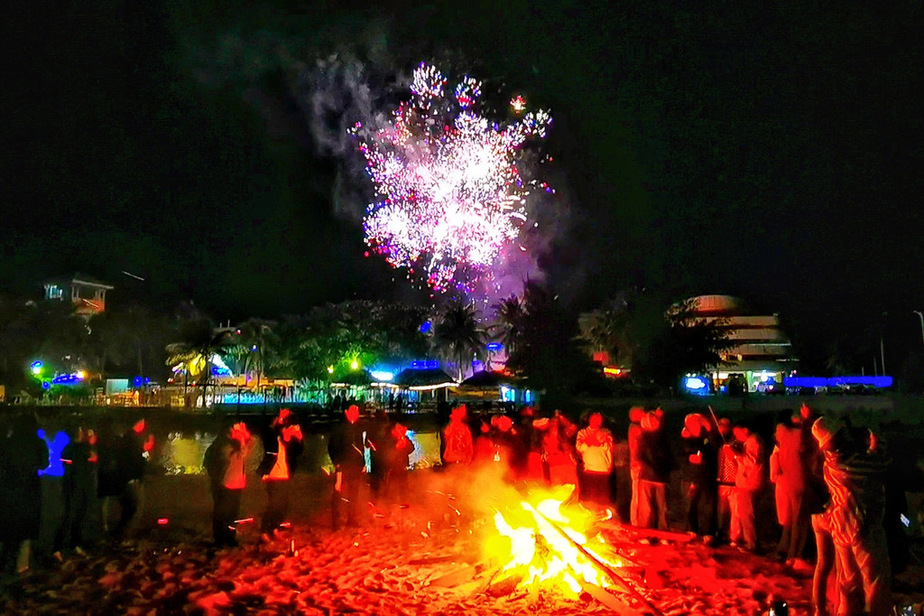 早早的选了个靠近海边的地方停车,窗外就是椰子树和沙滩,夜晚海上烟花绽放,时不时照亮车窗,气氛超棒。伴着烟花,放着跨年晚会视频,一家人在房车里准备晚餐,从兴隆南洋风味餐厅(太好吃了这家,爸妈一路都在念叨)打包了很多特色小吃,准备了各自喜欢的酒,挂上气氛担当星星灯,然后…拍照~