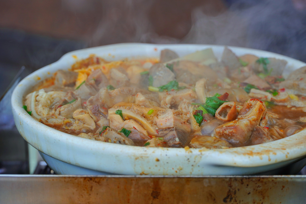 骑楼老街上,与历史的记忆共存的,还有当下生活的味道。走在街道上,时不时就会遇到当地人在骑楼下打牌吃火锅,我观察了一下,如果是吃炒菜,几乎桌桌都有白切鸡,吃火锅呢,大家最爱吃的就是牛杂煲,夜晚的街边,牛杂煲香气袅袅,太幸福了!