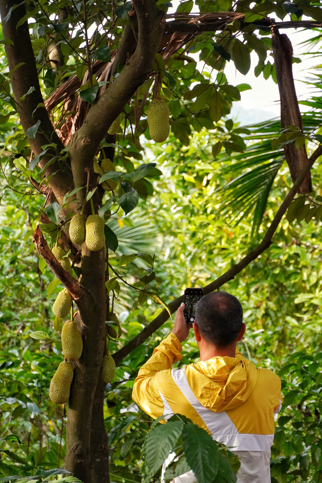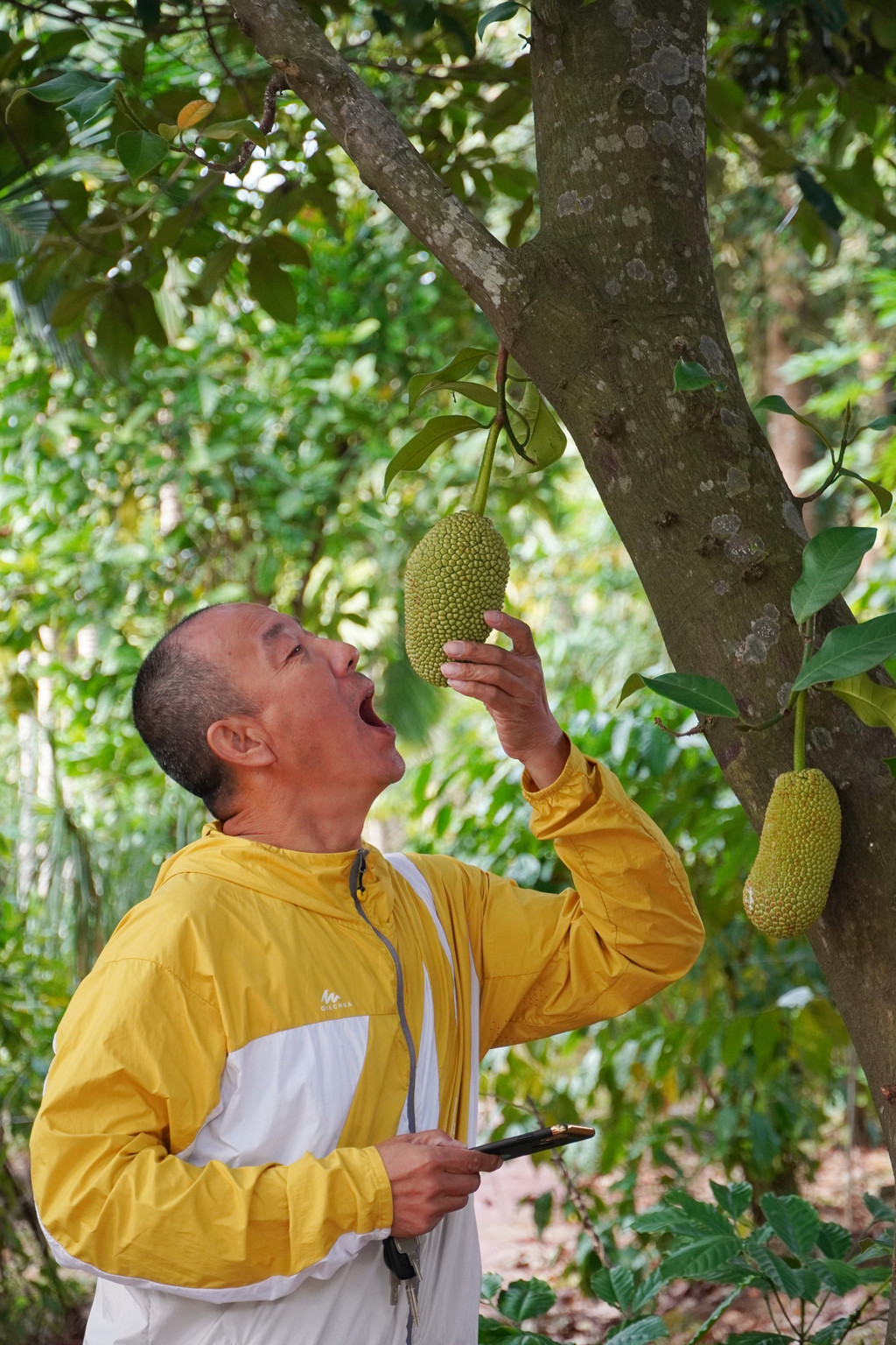 “你看这个,菠萝蜜,嚯!这么沉!长大了肯定挂不住啊,肯定得掉下来”