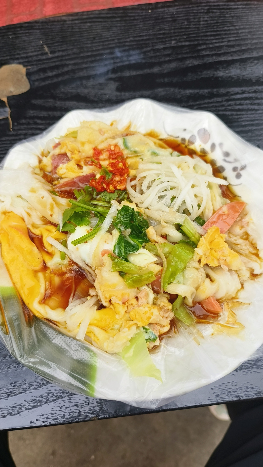 路边摊,但吃的人很多,老板都忙不过来。10块钱,味道很好,加了腊肠,火腿肠,鸡蛋,青菜,感觉是我吃过的最好吃的肠粉了。