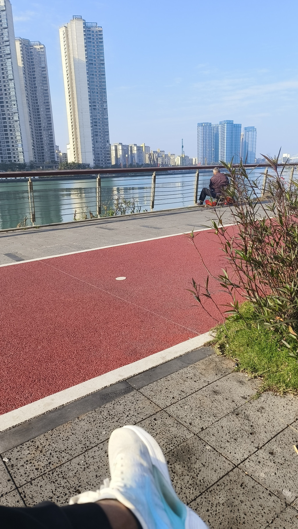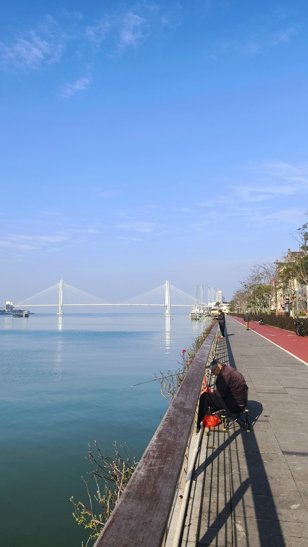 太阳晒在身上很舒服,岸边有钓鱼的大爷,还有晨跑的人。