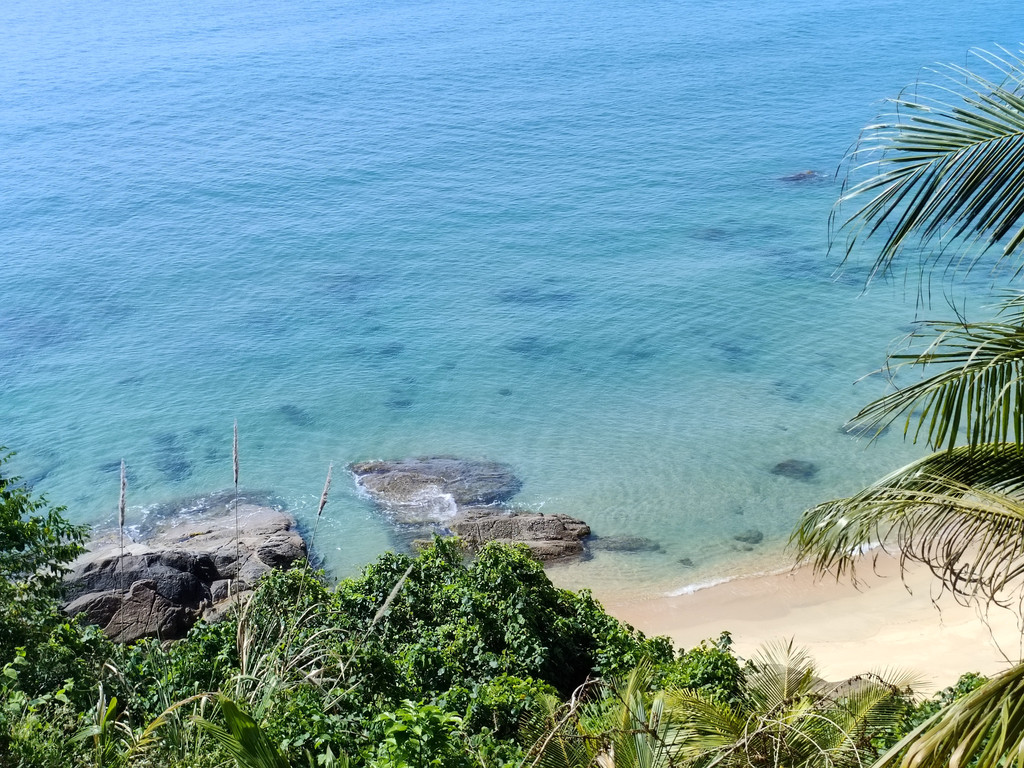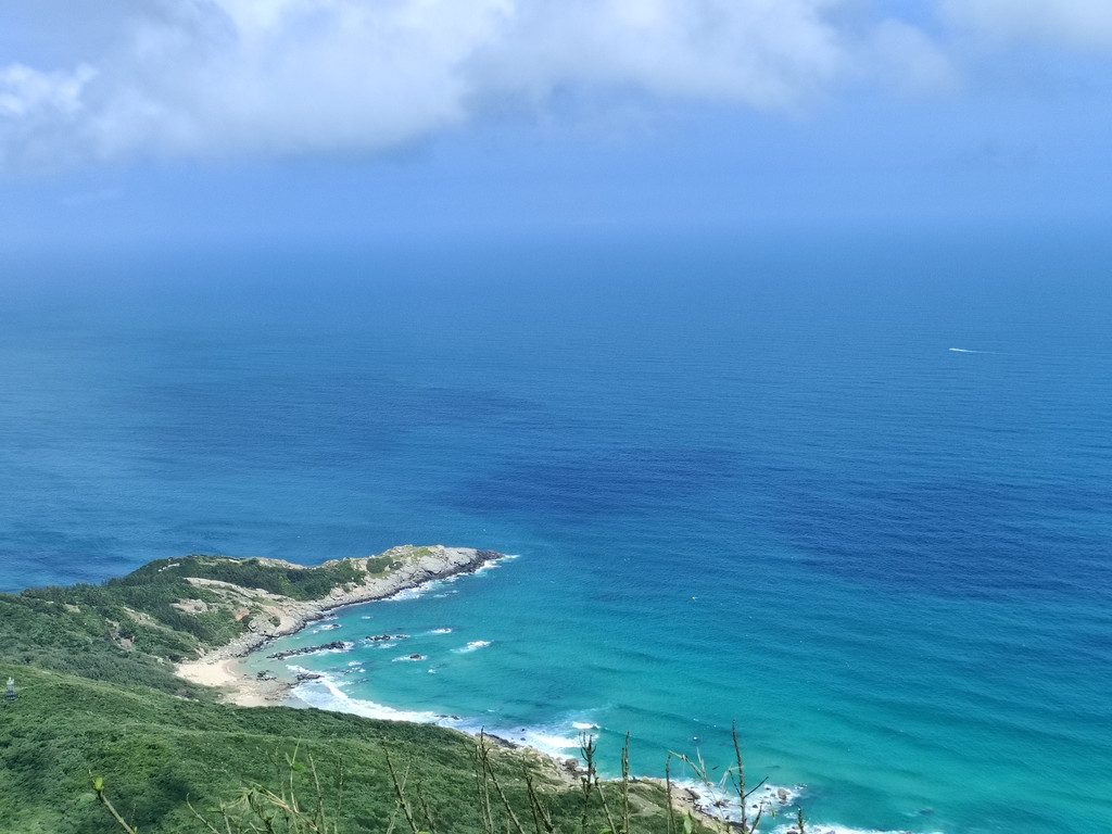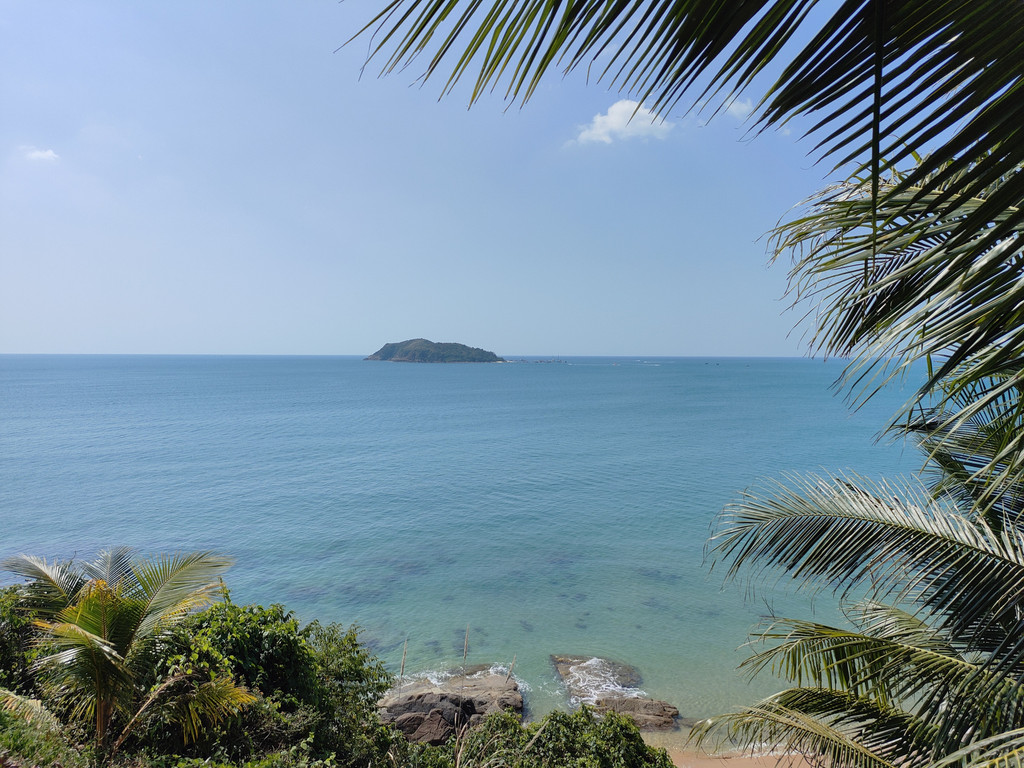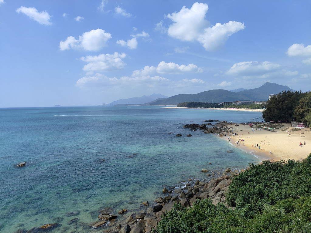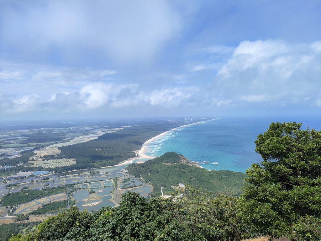 铜鼓岭山顶上可以看下面的月亮湾。在山上向下看,月亮湾是一个漂亮的弧形,白沙蓝海层层叠叠,另一边可以看见农家水田,一副田园牧歌景象。建议中午之后雾气散去之后再上山,不然可能影响风景和拍照效果。