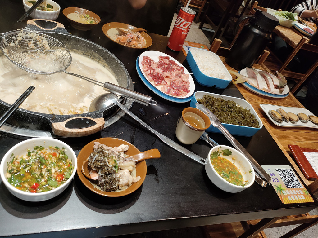 快离开海南才第一次吃糟粕醋火锅。点了他们家的套餐,有虾、金鲳鱼、鲍鱼、文昌鸡、海菜、米粉、牛肉。还送了饮料和蔬菜拼盘。海南的海鲜真的非常鲜活好吃,一点腥味也没有,肉质嫩滑。文昌鸡和牛肉也很好吃。但糟粕醋锅底煮青菜的味道个人感觉一般。