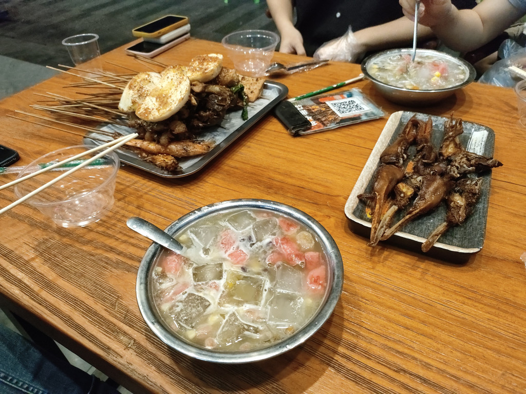 找了一家海南本地人才会去吃的烧烤。甘蔗做底的清补凉很好吃;鸭下巴似乎是接近油炸的做法,适合下酒;烤香菇味道也不错。其他都很一般,没有东北烧烤好吃。牛肉串也接近炸的口感,肉质很松软,但是吃着不像在吃肉。价格也不便宜。