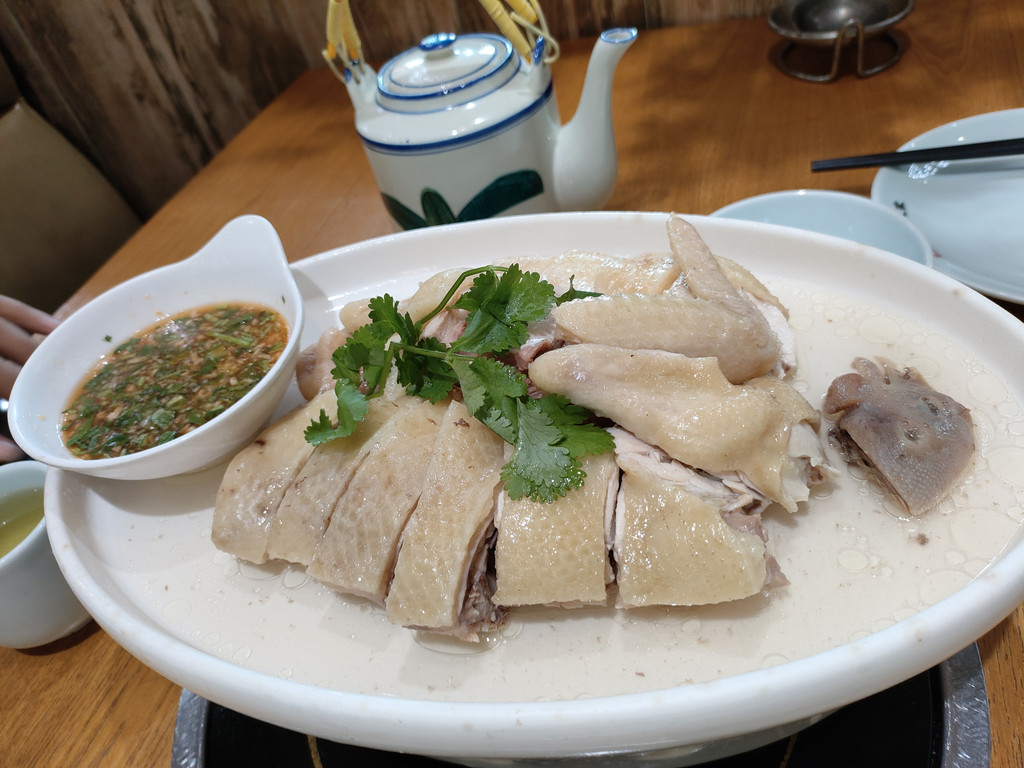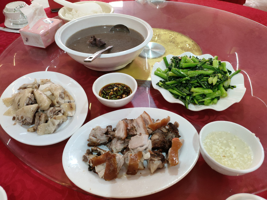 小红书推荐的陈记烤乳猪太火,没有服务员搭理我们,我们就来旁边一家叫福满园的店吃的。店里春节前刚开始接待散客,之前只做宴席。大众点评上有套餐,白切鸡、烤乳猪和炒时蔬。味道很棒。