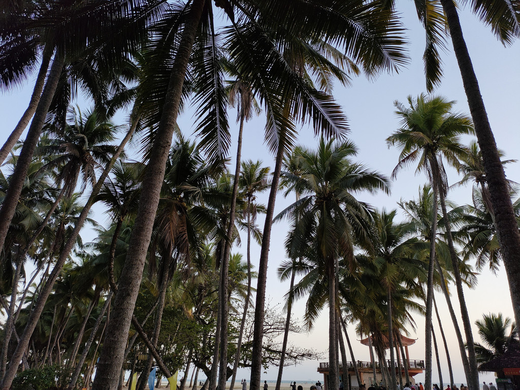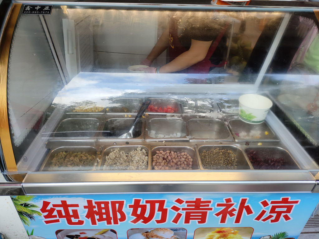 东郊椰林。从文昌向东走,有一片椰林。据说是自然形成的老椰林。附近有一片海滩,但沙滩和海都一般。椰林外有很多摊贩卖椰子制品。景区里这边应该算是椰子制品比较便宜的。在这里吃了椰子糕。似乎是糯米的外皮里面包着红糖椰子碎花生的馅料,粘粘的很好吃。