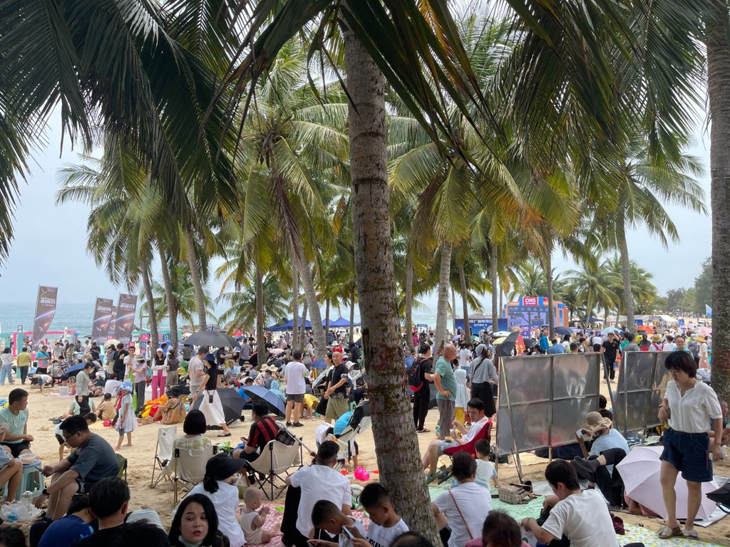 换上了游泳装备直接跑到海边去,准备玩水玩沙。出乎意料是海边已经挺多人了,有搭帐篷还有摆摊的,特别是在希尔顿的海滩前,竟然中央广播电视台都已经搭好棚子,安装好直播发射屏幕啦。