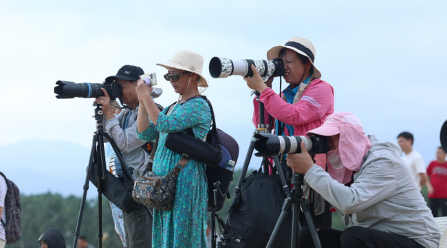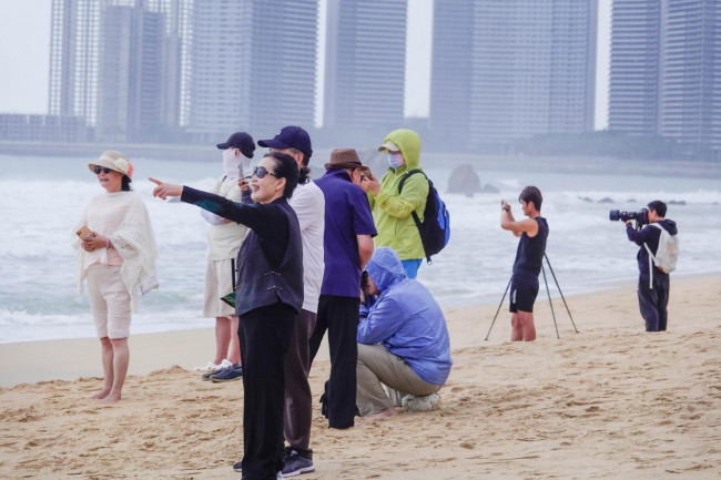跟着赛事去旅行,高水平的冲浪赛事吸引了来自全国各地的游客前来观赏。在赛场,每日可见近百名摄影爱好者手持各式相机,快门声此起彼伏。来自贵州的蔡永义先生对冲浪运动情有独钟,自日月湾举办首届冲浪比赛以来,他每年都会前往日月湾拍摄冲浪比赛,至今已持续十余年。他还组织了多场冲浪摄影专题讲座,影响了许多摄影爱好者,使他们也爱上了冲浪摄影。每当冲浪比赛举行,他们便相约在日月湾小住,共同享受这一时刻。来自唐山的亢女士目前在五指山度假,她表示,在比赛期间,她和摄影协会的许多会员已在日月湾附近预订了住宿,不仅能够欣赏到美丽的海滨风光,还能够满足他们的摄影爱好。除了这些资深摄影爱好者,比赛现场也吸引了众多游客前来,他们以赛场为背景,纷纷留影纪念。