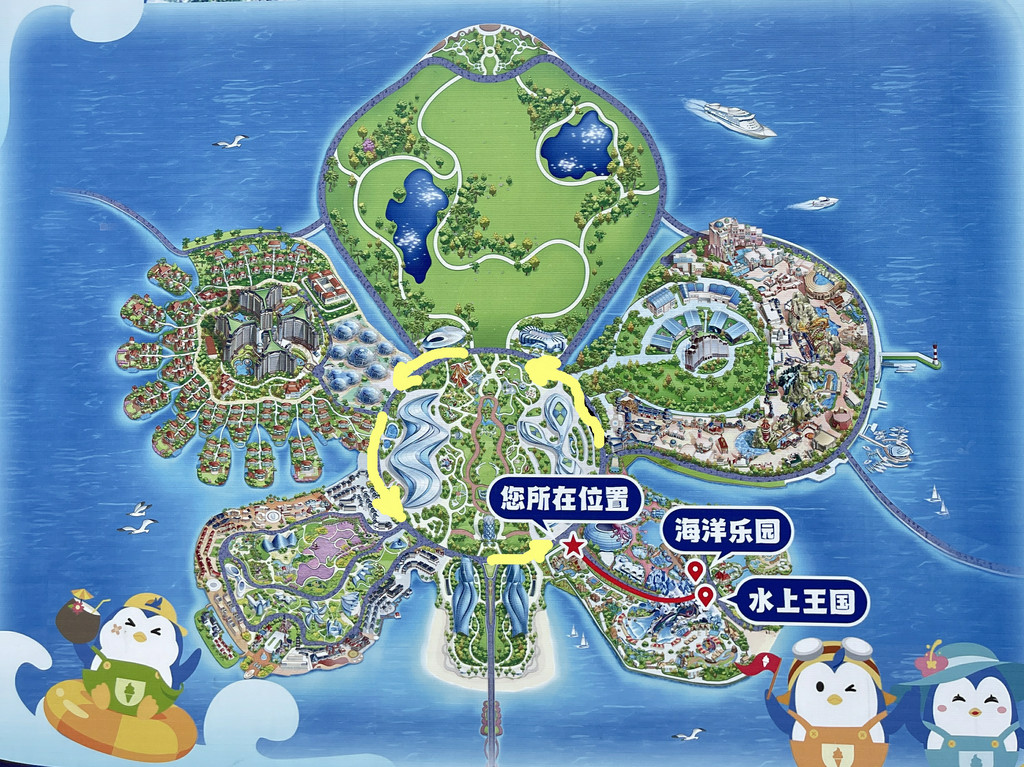 游览区在中间这个由中心岛加五个花瓣组成的岛上。中心岛有一条环路(逆时针单行)串起五个花瓣。