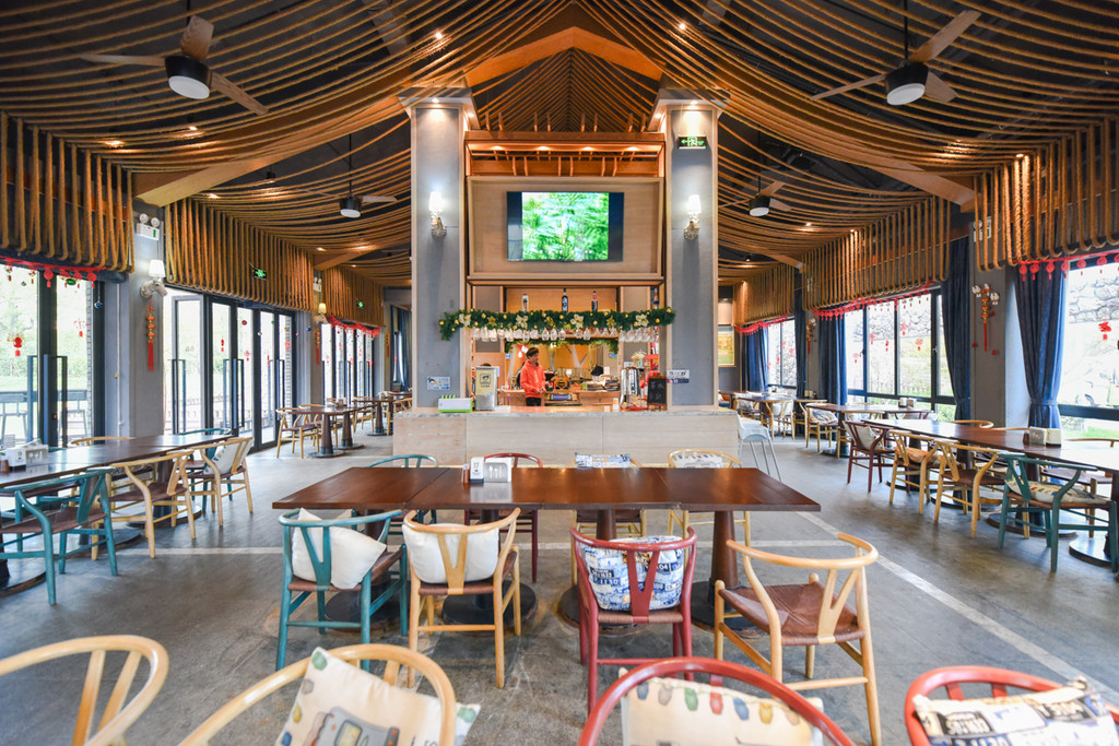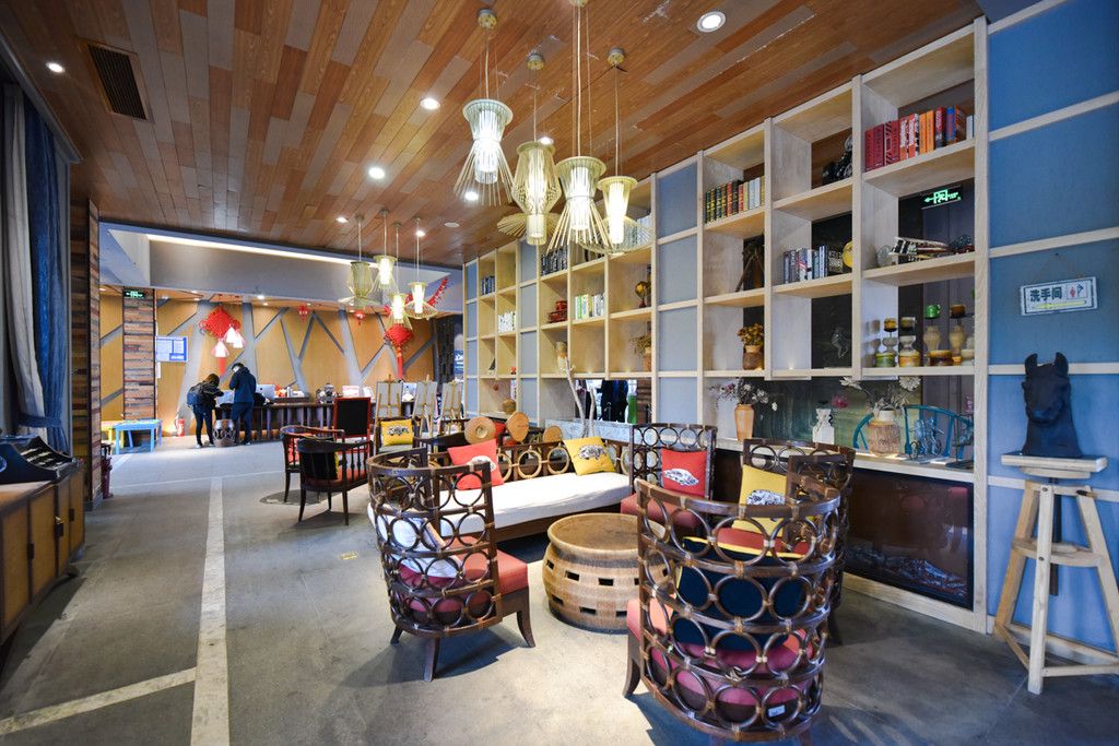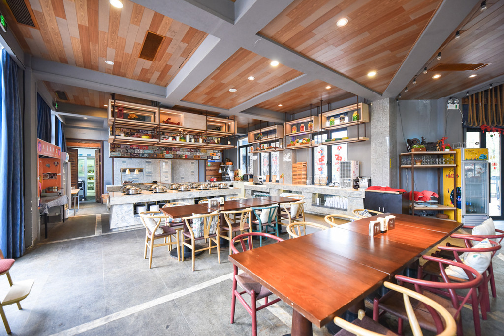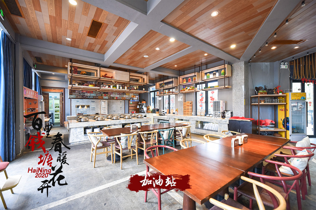 加油站集客房前台、阅读空间、室内游乐、水吧茶座、餐厅功能于一身,是团队拓展、亲友社交不可错过的好场所。采用实木材质的桌椅,辅以年轻活力的色彩,让人精神更愉悦,更自在舒适。