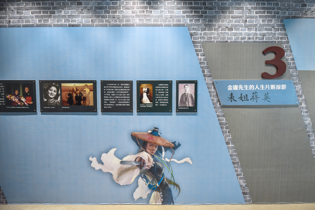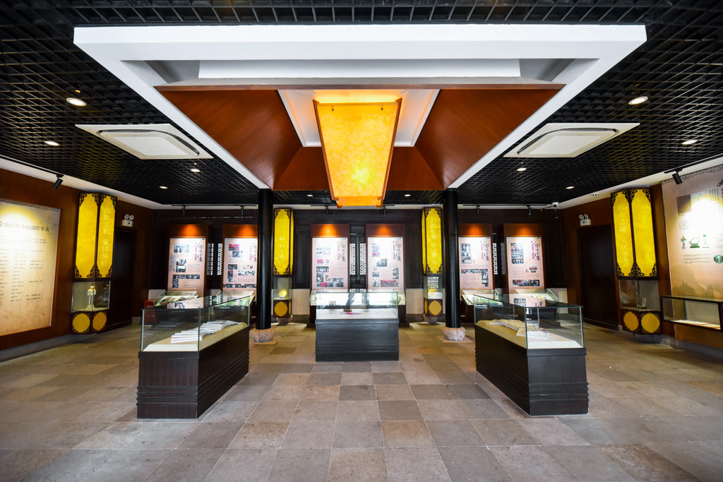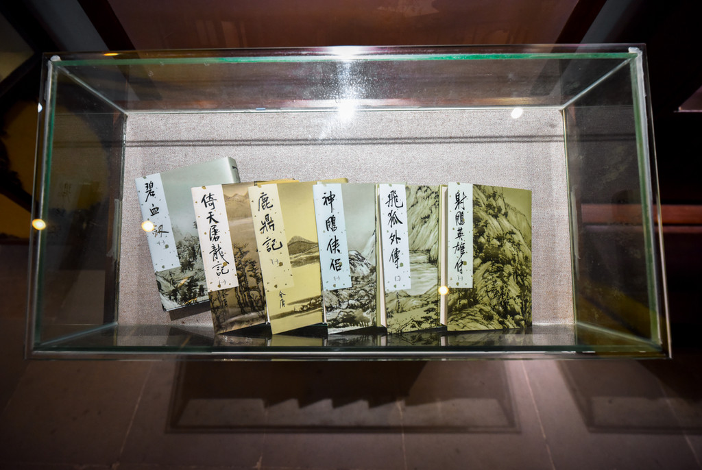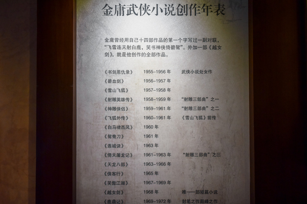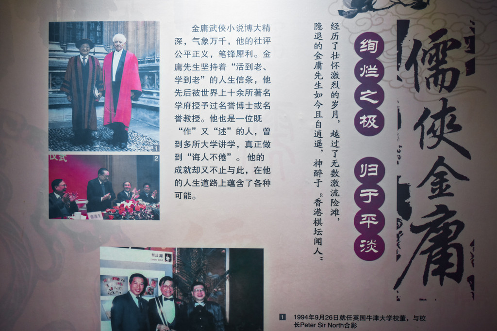 地面采用文化清水砖错拼,烘托出展厅的古朴沉稳。顶部黑色的格栅内镶有活动的轨道射灯,这样既便于照射展板,也渲染了展厅的气氛。底楼展示的是金庸的成就-“儒侠金庸陈列”,展厅正中的玻璃展柜里有金庸先生佩剑。在展厅灯光的照射下,即使剑未出鞘,也让人深深感受到了一种武侠的气息。展厅内四周设有展板,每个展板都附有柜体,既有文字说明,又有友人赠送的日文、韩文版金庸作品。印章展柜里收藏了“金庸书院”、“书剑堂”、“桃李门”等寿山石印章。二楼一排排木制的书柜里则收藏了金庸先生的著作。这是盐官执行最不能错过的展馆,不仅陈列很多真迹真品,很多奖杯证书都是独一无二的。